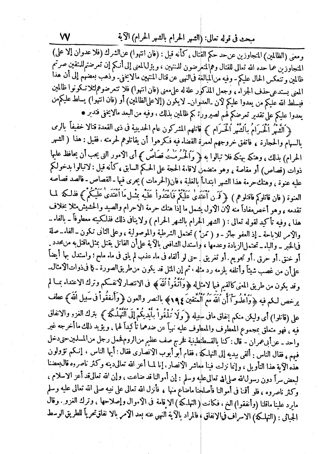 الشهر الحرام بالشهر الحرام قاتلهم المشركون عام الحديبية في ذي القعدة قتالا خفيفا بالرمي بالسهام والحجارة فأتفق خروجهم لعمرة القضاء فيه فكرهوا أن يقاتلوهم لحرمته فقيل : هذا الشهر الحرام بذلك وهتكه بهتكه فلا تبالوا به والحرمات قصاص أي الأمور التي يجب أن يحافظ عليها ذوات قصاص أو مقاصة وهو متضمن لإقامة الحجة على الحكم السابق كأنه قيل : لا تبالوا بدخولكم عليه عنوة وهتك حرمة هذا الشهر إبتداءا بالغلبة فإن الحرمات يجري فيهاالقصاصفالصد قصاصه العنوة فإن قاتلوكم فأقتلوهم فمن أعتدى عليكم فأعتدوا عليه بمثل ما أعتدى عليكم فذلكة لما تقدمه وهو أخص مفادا منه لأن الأول يشمل ما إذا هتك حرمة الإحرام والصيد والحشيش مثلا بخلاف هذا وفيه تأكيد لقوله تعالى : الشهر الحرام بالشهر الحرام ولا ينافي ذلك فذلكيته معطوفابالفاءوالأمر للإباحةإذ العفو جائزو من تحتمل الشرطية والموصولية وعلى الثاني تكونالفاءصلة في الخبروالباءتحتم الزيادة وعدمها وأستدل الشافعي بالآية على أن القاتل يقتل بمثل ما قتل به من محدد أو خنق أو حرق أو تجويع أو تغريق حتى لو ألقاه في ماء عذب لم يلق في ماء ملح : وأستدل بها أيضا على أن من غصب شيئا وأتلفه يلزمه رد مثله ثم إن المثل قد يكون من طريق الصورة كما في ذوات الأمثالوقد يكون من طريق المعنى كالقيم فيما لا مثل له وأتقوا الله في الإنتصار لأنفسكم وترك الإعتداء بما لم يرخص لكم فيه وأعلموا أن الله مع المتقين 491 بالنصر والعون وأنفقوا في سبيل الله عطف على قاتلوا أي وليكن منكم إنفاق ما في سبيله ولا تلقوا بأيديكم إلى التهلكة بترك الغزو والإنفاق فيه فهو متعلق بمجموع المعطوف والمعطوف عليه نهيا عن ضدهما تأكيدا لهما ويؤيد ذلك ما أخرجه غير واحدعن أبي عمرانقال : كنا بالقسطنطينية فخرج صف عظيم من الروم فحمل رجل من المسلمين حتى دخل فيهم فقال الناس : ألقى بيديه إلى التهلكة فقام أبو أيوب الأنصاري فقال : أيها الناس إنكم تؤولون هذه الآية هذا التأويل وإنما نزلت فينا معاشر الأنصار إنا لما أعز الله تعالى دينه وكثر ناصروه قال بعضنا لبعض سرا دون رسول الله صلى الله تعالى عليه وسلم : إن أموالنا قد ضاعت وإن الله تعالى قد أعز الإسلام وكثر ناصروه فلو أقمنا في أموالنا فأصلحنا ما ضاع منها فأنزل الله تعالى على نبيه صلى الله تعالى عليه وسلم ما يرد علينا ما قلنا وأنفقوا إلخ فكانت التهلكة إلاقامة في الأموال وإصلاحها وترك الغزو وقال الجبائي : التهلكة الإسراف في الإنفاق فالمراد بالآية النهي عنه بعد الأمر بالإنفاق تحريا للطريق الوسط