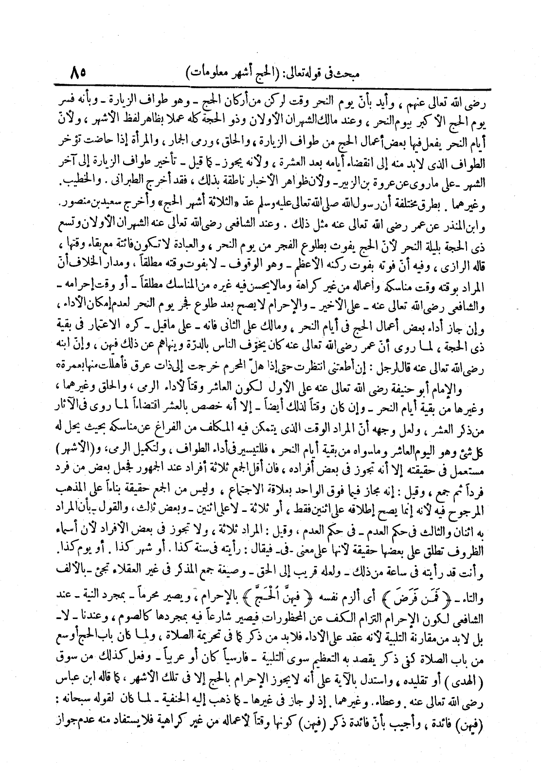 رضي الله تعالى عنهم وأيد بأن يوم النحر وقت لركن من أركان الحجوهو طواف الزيارةوبأنه فسر يوم الحج الأكبر بيوم النحر وعند مالك الشهران الأولان وذو الحجة كله عملا بظاهر لفظ الأشهر ولأن أيام النحر يفعل فيها بعض أعمال الحج من طواف الزيارة والحلق ورمي الجمار والمرأة إذا حاضت تؤخر الطواف الذي لا بد منه إلى إنقضاء أيامه بعد العشرة ولأنه يجوزكما قيلتأخير طواف الزيارة إلى آخر الشهرعلى ما روى عن عروة بن الزبيرولأن ظواهر الأخبار ناطقة بذلك فقد أخرج الطبراني والخطيب وغيرهما بطرق مختلفة أن رسول الله صلى الله تعالى عليه وسلم عد الثلاثة أشهر الحج وأخرج سعيد بن منصور وإبن المنذر عن عمر رضي الله تعالى عنه مثل ذلك وعند الشافعي رضي الله تعالى عنه الشهران الأولان وتسع ذي الحجة بليلة النحر لأن الحج يفوت بطلوع الفجر من يوم النحر والعبادة لا تكون فائتة مع بقاء وقتها قاله الرازي وفيه أن فوته بفوت ركنه الأعظموهو الوقوفلا بفوت وقته مطلقا ومدار الخلاف أن المراد بوقته وقت مناسكه وأعماله من غير كراهة وما لا يحسن فيه غيره من المناسك مطلقاأو وقت إحرامه والشافعي رضي الله تعالى عنهعلى الأخيروالإحرام لا يصح بعد طلوع فجر يوم النحر لعدم إمكان الأداء وإن جاز أداء بعض أعمال الحج في أيام النحر ومالك على الثاني فإنهعلى ما قيلكره الإعتمار في بقية ذي الحجة لما روى أن عمر رضي الله تعالى عنه كان يخوف الناس بالدرة وينهاهم عن ذلك فيهن وإن إبنه رضي الله تعالى عنه قال لرجل : إن أطعمتني أنتظرت حتى إذا هل المحرم خرجت إلى ذات عرق فأهللت منها بعمرة