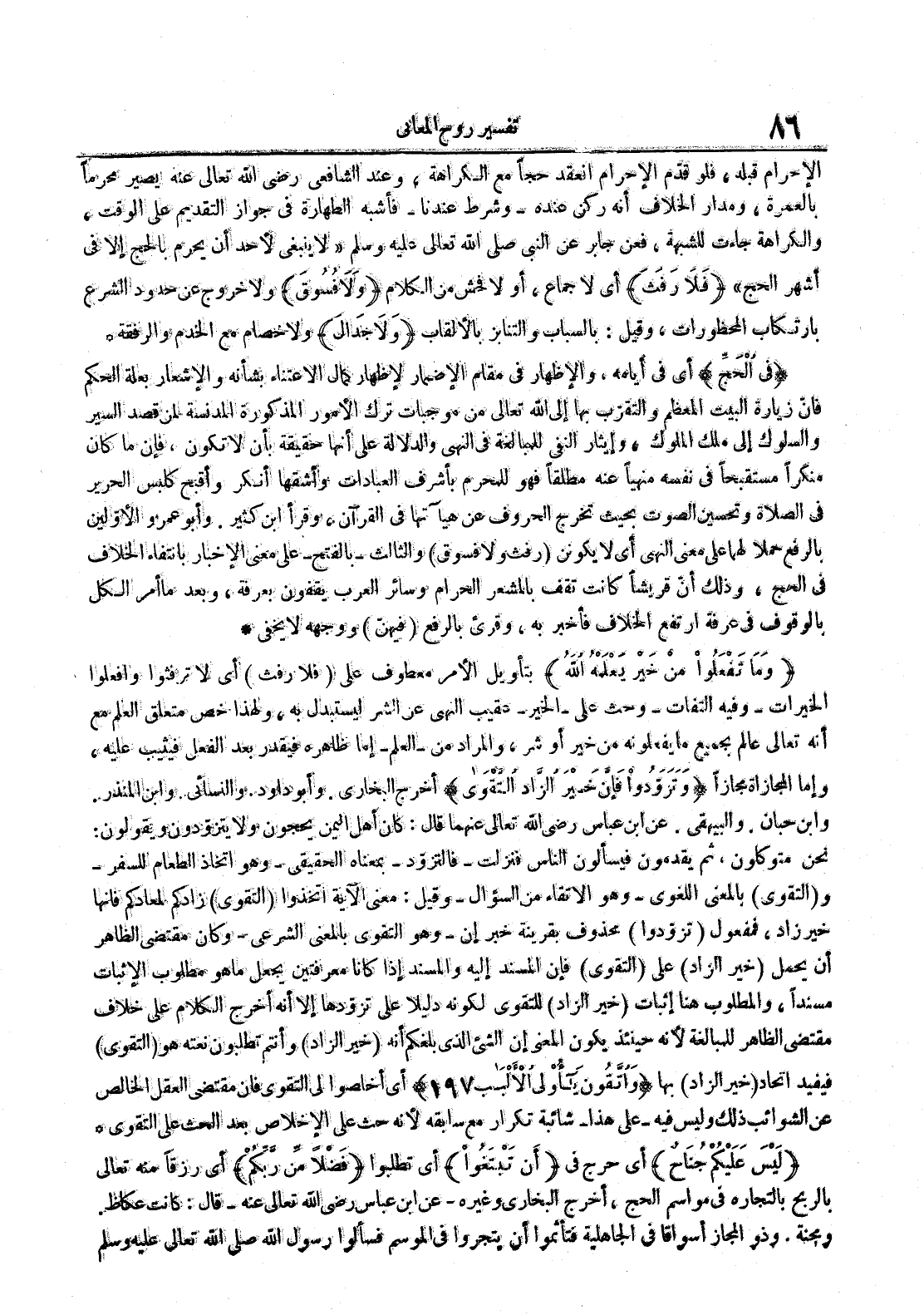 وما تفعلوا من خير يعلمه الله بتأويل الأمر معطوف على فلا رفث أي لا ترفثوا وأفعلوا الخيراتوفيه إلتفاتوحث علىالخيرعقيب النهي عن الشر ليستبدل به ولهدا خص متعلق العلم مع أنه تعالى عالم بجميع ما يفعلونه من خير أو شر والمراد منالعلمإما ظاهره فيقدر بعد الفعل فيثيب عليه وإما المجازاة مجازا وتزودوا فإن خير الزاد التقوى أخرج البخاري وأبو داؤد والنسائي وإبن المنذر وإبن حبان والبيهقي عن إبن عباس رضي الله تعالى عنهما قال : كان أهل اليمن يحجون ولا يتزودون ويقولون : نحن متوكلون ثم يقدمون فيسألون الناس فنزلتفلتزودبمعناه الحقيقيوهو إتخاذ الطعام للسفرو القتوى بالمعنى اللغويوهو الإتقاء من السؤالوقيل : معنى الآية إتخذوا التقوى زادكم لمعادكم فإنها خير زاد فمفعول تزودوا محذوف بقرينة خبر إنوهو التقوى بالمعنى الشرعيوكان مقتضى الظاهر أن يحمل خير الزاد على التقوى فإن المسند إليه والمسند إذا كانا معرفتين يجعل ما هو مطلوب الإثبات مسندا والمطلوب هنا إثبات خير الزاد للتقوى لكونه دليلا على تزودها إلا أنه أخرج الكلام على خلاف مقتضى الظاهر للمبالغة لأنه حينئذ يكون المعنى إن الشيء الذي بلغكم أنه خير الزاد وأنتم تطلبون نعته هو التقوى فيفيد إتحاد خير الزاد بها وأتقون يأولي الألباب 791 أي أخلصوا لي التقوى فإن مقتضى العقل الخالص عن الشوائب ذلك وليس فيهعلى هذاشائبة تكرار مع سابقه لأنه حث على الإخلاص بعد الحث على التقوى