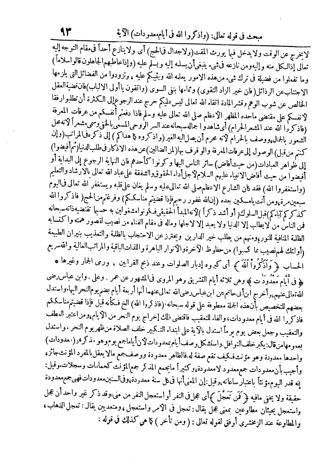 لا يخرج عن الوقت ولايدخل فيما يورث المقت ولا جدال في الحج أي ولا ينازع أحدا في مقام التوجه إليه تعالى إذ الكل منه وإليه ومن نازعه في شيء ينبغي أن يسلمه إليه ويسلم عليه وإذا خاطبهم الجاهلون قالوا سلاما وما تفعلوا من فضيلة في ترك شيء من هذه الأمور يعلمه الله ويثيبكم عليه وتزودوا من الفضائل التي يلزمها الإجتناب عن الرذائل فإن خير الزاد التقوى وتمامها بنفي السوي وأتقون ياأولي الألباب فإن قضية العقل الخالص عن شوب الوهم وقشر المادةإتقاء الله تعالى ليس عليكم حرج عند الرجوع إلى الكثرة أن تطلبوا رفقا لأنفسكم على مقتضى ما حده المظهر الأعظم صلى الله تعالى عليه وسلم فإذا دفعتم أنفسكم من عرفات المعرفة فأذكروا الله عند المشعر الحرام أي شاهدوا جماله سبحانه عند السر الروحي المسمى بالخفي وسمى مشعرا لأنه محل الشعور بالجمال وووصف بالحرام لأنه محرم أن يصل إليه الغير وأذكروه كما هداكم إلى ذكره في المراتب وإن كنتم من قبل الوصول إلى عرفات المعرفة والوقوف بها لمن الضالين عن هذه الإذكار في طلب الدنيا ثم أفيضوا إلى ظواهر العبادات من حيث أفاض سائر الناس إليها وكونوا كأحدهم فإن النهاية الرجوع إلى البداية أو أفيضوا من حيث أفاض الأنبياء عليهم السلام لأجل أداء الحقوق والشفقة على عباد الله تعالى بالإرشاد والتعليم وأستغفروا الله فقد كان الشارع الأعظم صلى الله تعالى عليه وسلم يغان على قلبه ويستغفر الله تعالى في اليوم سبعين مرة ومن أنت يامسكين بعده إن الله غفور رحيم فإذا قضيتم مناسككم وفرغتم من الحج فأذكروا الله كذكركم آباءكم قبل السلوك أو أشد ذكرا لأن المبدأ الحقيقي فكونوا مشغولين به حسبما تقتضيه ذاته سبحانه فمن الناس من لا يطلب إلا الدنيا ولا يعبد إلا لأجلها وماله في مقام الفناء من نصيب لقصور همته وإكتسابه الظلمة المنافية للنور ومنهم من يطلب خير الدارين ويحترز عن الإحتجاب بالظمة والتعذيب بنيران الطبيعة أولئك لهم نصيب مما كسبوا من حظوظ الآخرة والأنوار الباهرة واللذات الباقية والمراتب العالية والله سريع الحساب وأذكروا الله أي كبروه إدبار الصلوات وعند ذبح القرابينورمي الجمار وغيرها