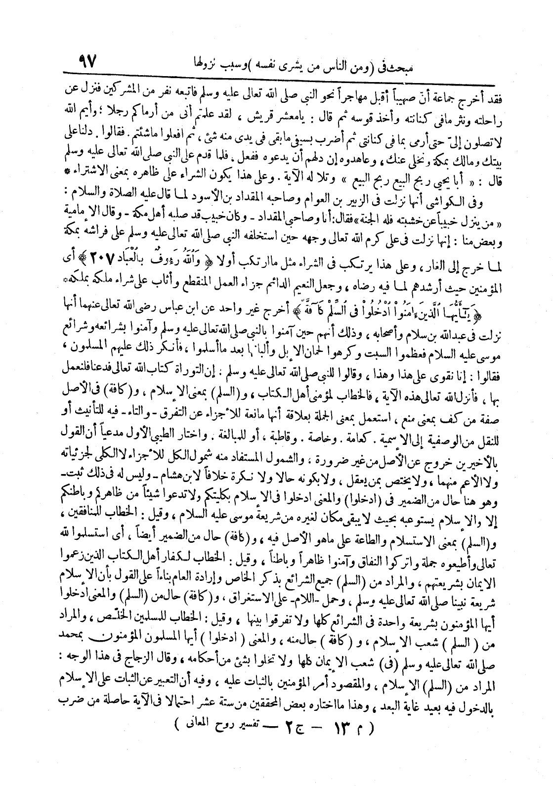 ياأيها الذين آمنوا أدخلوا في السلم كآفة أخرج غير واحد عن إبن عباس رضي الله تعالى عنهما أنها نزلت في عبدالله بن سلام وأصحابه وذلك أنهم حين آمنوا بالنبي صلى الله تعالى عليه وسلم وآمنوا بشرائعه وشرائع موسى عليه السلام فعظموا السبت وكرهوا لحمان الإبل وألبانها بعد ما أسلموا فأنكر ذلك عليهم المسلمون فقالوا : إنا نقوي على هذا وهذا وقالوا للنبي صلى الله تعالى عليه وسلم : إن التوراة كتاب الله تعالى فدعنا فلنعمل بها فأنزل الله تعالى هذه الآية فالخطاب لمؤمني أهل الكتاب و السلم بمعنى الإسلام و كافة في الأصل صفة من كف بمعنى منع أستعمل بمعنى الجملة بعلاقة أنها مانعة للأجزاء عن التفرقوالتاءفيه للتأنيث أو للنقل من الوصفية إلى الإسمية كعامة وخاصة وقاطبة أو للمبالغة وأختار الطيبي الأول مدعيا أن القول بالأخيرين خروج عن الأصل من غير ضرورة والشمول المستفاد منه شمول الكل للأجزاء لا الكلي لجزئياته ولا الأعم منهما ولا يختص بمن يعقل ولا بكونه حالا ولا نكرة خلافا لإبن هشاموليس له في ذلك ثبتوهو هنا حال من الضمير في أدخلوا والمعنى أدخلوا في الإسلام بكليتكم ولا تدعوا شيئا من ظاهركم وباطنكم إلا والإسلام يستوعبه بحيث لا يبقى مكان لغيره من شريعة موسى عليه السلام وقيل : الخطاب للمنافقين و السلم بمعنى الإستسلام والطاعة على ما هو الأصل فيه و كافة حال من الضمير أيضا أي أستسلموا لله تعالى وأطيعوه جملة وأتركوا النفاق وآمنوا ظاهرا وباطنا وقيل : الخطاب لكفار أهل الكتاب الذين زعموا الإيمان بشريعتهم والمراد من السلم جميع الشرائع بذكر الخاص وإرادة العام بناءا على القول بأن الإسلام شريعة نبينا صلى الله تعالى عليه وسلم وحملاللامعلى الإستغراق و كافة حال من السلم والمعنى أدخلوا أيها المؤمنون بشريعة واحدة في الشرائع كلها ولا تفرقوا بينها وقيل : الخطاب للمسلمين الخلص والمراد من السلم شعب الإسلام و كافة حال منه والمعنى أدخلوا أيها المسلمون المؤمنون بمحمد صلى الله تعالى عليه وسلم في شعب الإيمان كلها ولا تخلوا بشيء من أحكامه وقال الزجاج في هذا الوجه : المراد من السلم الإسلام والمقصود أمر المؤمنين بالثبات عليه وفيه أن التعبير عن الثبات على الإسلام بالدخول فيه بيعد غاية البعد وهذا ما أختاره بعض المحققين من ستة عشر إحتمالا في الآية حاصلة من ضرب