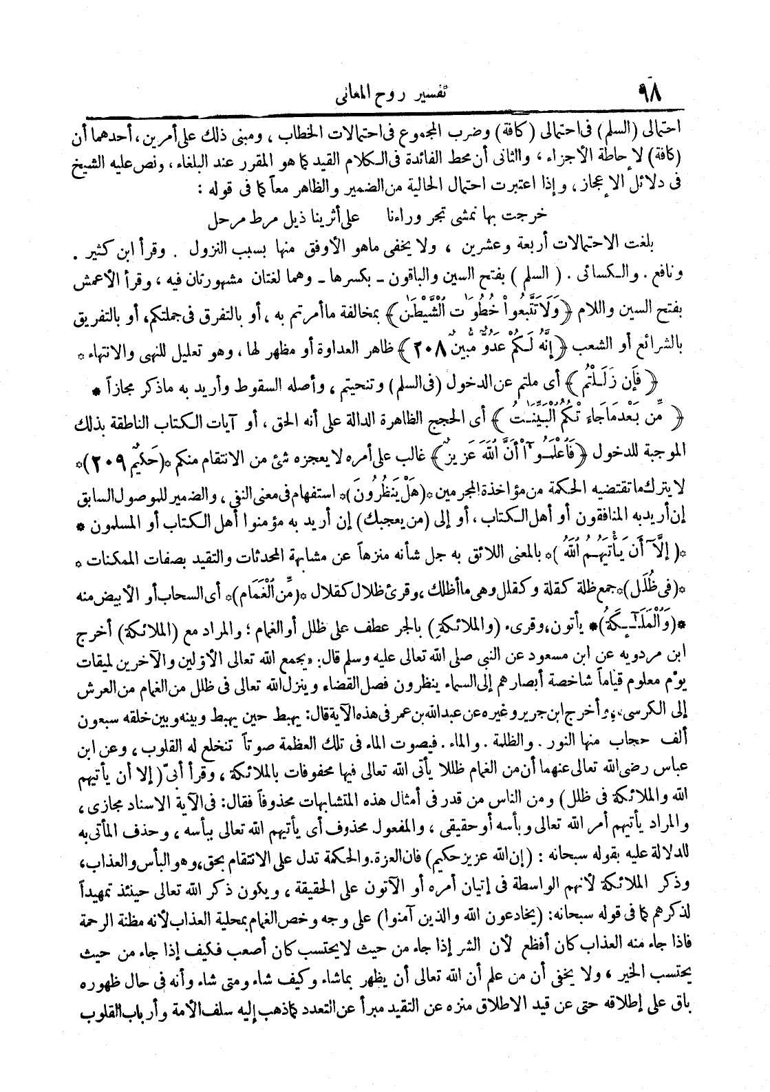 إحتمالي السلم في إحتمالي كافة وضرب المجموع في إحتمالات الخطاب ومبني ذلك على أمرين أحدهما أن كافة لإحاطة الأجزاء والثاني أن محط الفائدة في الكلام القيد كما هو المقرر عند البلغاء ونص عليه الشيخ في دلائل الإعجاز وإذا أعتبرت إحتمال الحالية من الضمير والظاهر معا كما في قوله : خرجت بها نمشي تجر وراءنا على أثرينا مرط مرحل بلغت الإحتمالات أربعة وعشرين ولا يخفى ما هو الأوفق منها بسبب النزول وقرأ إبن كثير ونافع والكسائي السلم بفتح السين والباقونبكسرهاوهما لغتان مشهورتان فيه وقرأ الأعمش بفتح السين واللام ولا تتبعوا خطوات الشيطان بمخالفة ما أمرتم به أو بالتفرق في جملتكم أو بالتفريق بالشرائع أو الشعب إنه لكم عدو مبين 802 ظاهر العداوة أو مظهر لها وهو تعليل للنهي والإنتهاء