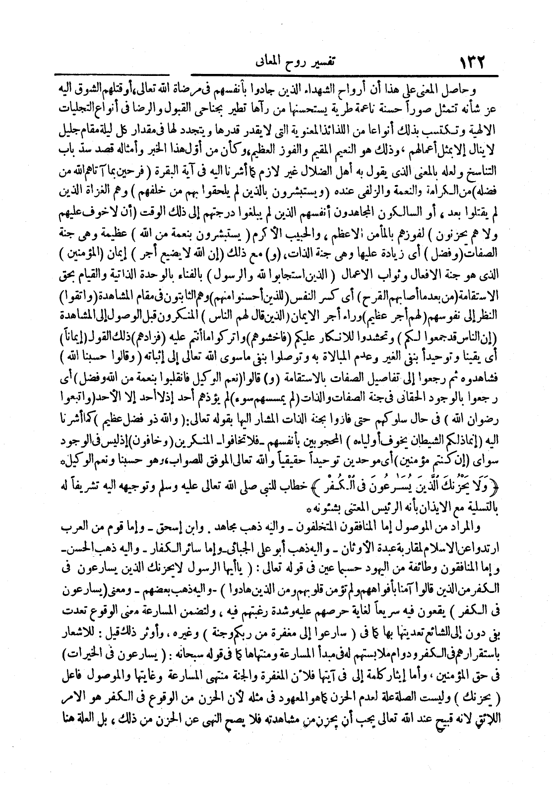 وحاصل المعنى على هذا أن أرواح الشهداء الذين جادوا بأنفسهم في مرضاة الله تعالى أو قتلهم الشوق إليه عز شأنه تتمثل صورا حسنة ناعمة طرية يستحسنها من رآها تطير بجناحي القبول والرضا في أنواع التجليات الألهية وتكتسب بذلك أنواعا من اللذائذ المعنوية التي لا يقدر قدرها ويتجدد لها في مقدار كل ليلة مقام جليل لا ينال إلا بمثل أعمالهم وذلك هو النعيم المقيم والفوز العظيم وكأن من أول هذا الخبر وأمثاله قصد سد باب التناسخ ولعله بالمعنى الذي يقول به أهل الضلال غير لازم كما أشرنا إليه في آية البقرة فرحين بما آتاهم الله من فضله من الكرامة والنعمة والزلفى عنده ويستبشرون بالذين لم يلحقوا بهم من خلفهم وهم الغزاة الذين لم يقتلوا بعد أو السالكون المجاهدون أنفسهم الذين لم يبلغوا درجتهم إلى ذلك الوقت أن لا خوف عليهم ولا هم يحزنون لفوزهم بالمأمن الأعظم والحبيب الأكرم يستبشرون بنعمة من الله عظيمة وهي جنة الصفات وفضل أي زيادة عليها وهي جنة الذات و مع ذلك إن الله لا يضيع أجر إيمان المؤمنين الذي هو جنة الأفعال وثواب الأعمال الذين أستجابوا لله والرسول بالفناء بالوحدة الذاتية والقيام بحق الإستقامة من بعدما أصابهم القرح أي كسر النفس للذين أحسنوا منهم وهم الثابتون في مقام المشاهدة وأتقوا النظر إلى نفوسهم لهم أجر عظيم وراء أجر الإيمان الذين قال لهم الناس المنكرون قبل الوصول إلى المشاهدة إن الناس قد جمعوا لكم وتحشدوا للإنكار عليكم فأخشوهم وأتركوا ما أنتم عليه فزادهم ذلك القول إيمانا أي يقينا وتوحيدا بنفي الغير وعدم المبالاة به وتوصلوا بنفي ما سوى الله تعالى إلى إثباته وقالوا حسبنا الله فشاهدوه ثم رجعوا إلى تفاصيل الصفات بالإستقامة و قالوا نعم الوكيل فأنقلبوا بنعمة من الله وفضل أي رجعوا بالوجود الحقاني في جنة الصفات والذات لم يمسسهم سوء لم يؤذهم أحد إذ لا أحد إلا الأحد وأتبعوا رضوان الله في حال سلوكهم حتى فازوا بجنة الذات المشار إليها بقوله تعالى : والله ذو فضل عظيم كما أشرنا إليه إنما ذلكم الشيطان يخوف أولياءه المحجوبين بأنفسهمفلا تخافواالمنكرين وخافون إذ ليس في الوجود سوأى إن كنتم مؤمنين أي موحدين توحيدا حقيقيا والله تعالى الموفق للصواب وهو حسبنا ونعم الوكيل
