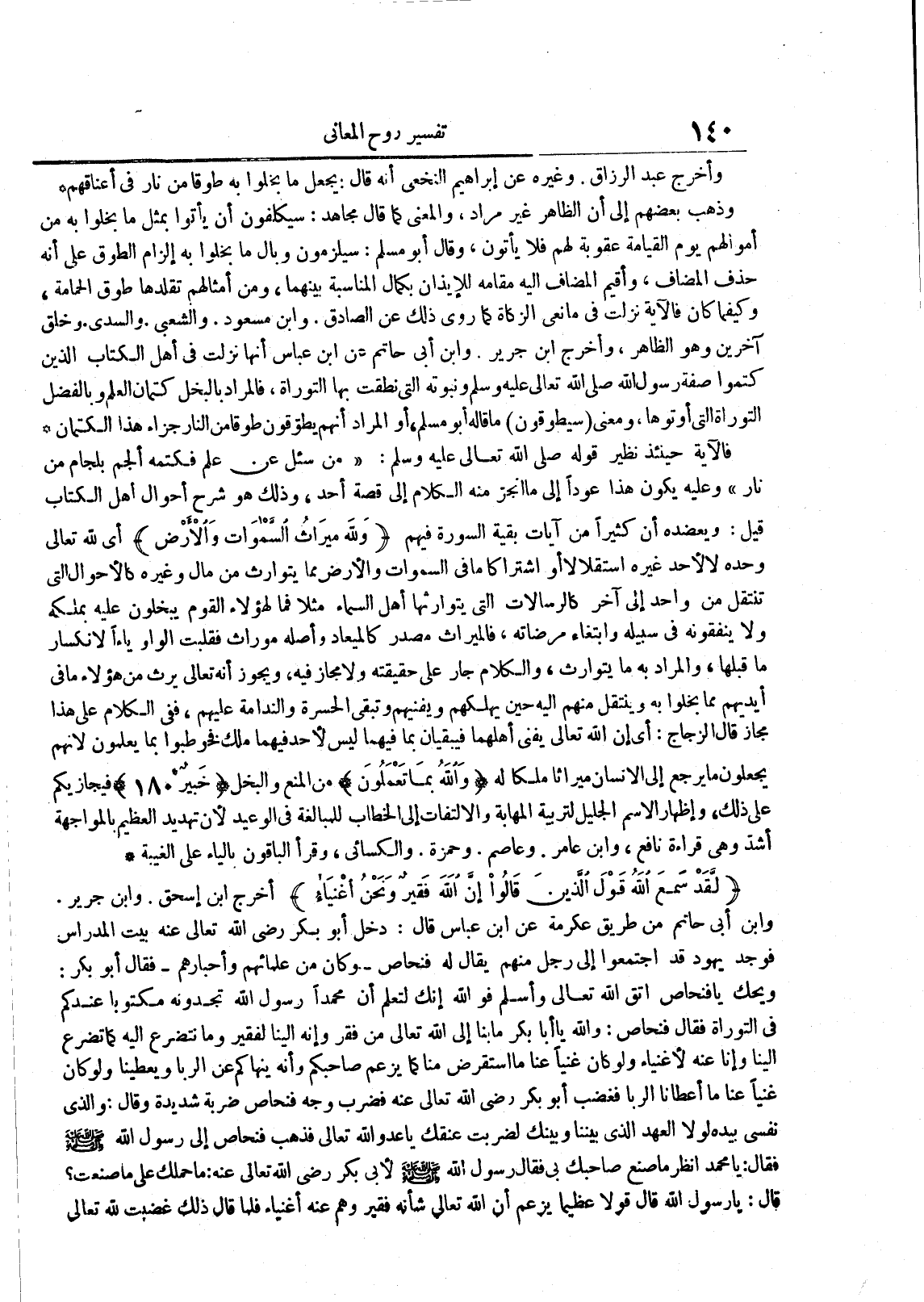 لقد سمع الله قول الذين قالوا إن الله فقير ونحن أغنياء أخرج إبن إسحاق وإبن جرير وإبن أبي حاتم من طريق عكرمة عن إبن عباس قال : دخل أبو كبر رضي الله تعالى عنه بيت المدراس فوجد يهود قد أجتمعوا إلى رجل منهم يقال له فنحاص وكان من علمائهم وأحبارهم فقال أبو بكر : ويحك يا فنحاص اتق الله تعالى وأسلم فوالله إنك لتعلم أن محمدا رسول الله تجدونه مكتوبا عندكم في التوراة فقال فنحاص : والله يا أبا بكر ما بنا إلى الله تعالى من فقر وإنه إلينا لفقير وما نتضرع إليه كما تضرع إلينا وإنا عنه لأغنياء ولو كان غنيا عنا ما استقرض منا كما يزعم صاحبكم وأنه ينهاكم عن الربا ويعطينا ولو كان غنيا عنا ما أعطانا الربا فغضب أبو بكر رضي الله تعالى عنه فضرب وجه فنحاص ضربة شديدة وقال : والذي نفسي بيده لولا العهد الذي بيننا وبينك لضربت عنقك يا عدو الله تعالى فذهب فنحاص إلى رسول الله فقال : يا محمد أنظر ما صنع صاحبك بي فقال رسول الله لأبي بكر رضي الله تعالى عنه : ما حملك على ما صنعت قال : يا رسول الله قال قولا عظيما يزعم أن الله تعالى شأنه فقير وهم عنه أغنياء فلما قال ذلك غضبت لله تعالى
