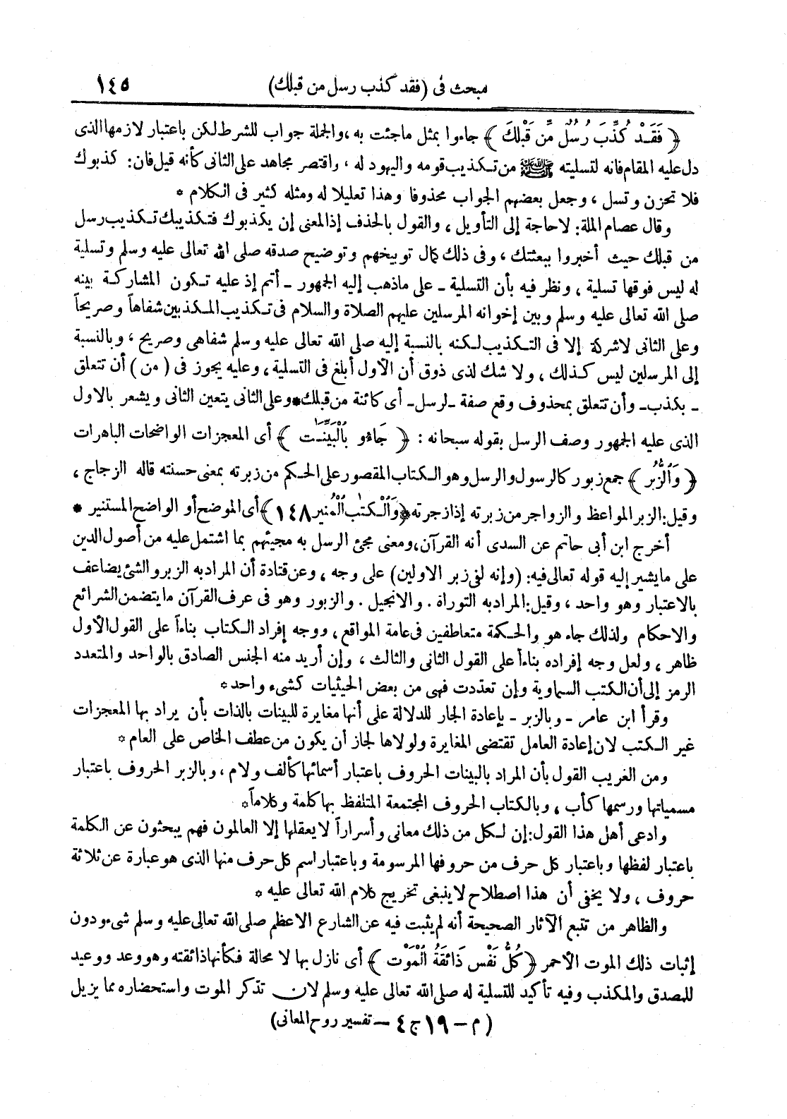 ومن الغريب القول بأن المراد بالبينات الحروف بإعتبار أسمائها كألف ولام وبالزبر الحروف بإعتبار مسمياتها ورسمها كأب وبالكتاب الحروف المجتمعة المتلفظ بها كلمة وكلاما