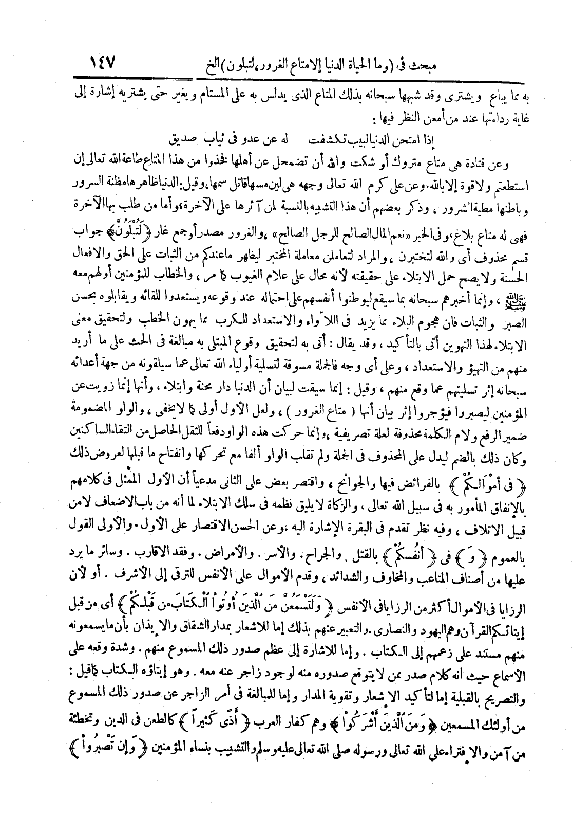 به مما يباع ويشتري وقد شبهها سبحانه بذلك المتاع الذي يدلس به على المستام ويغير حتى يشتريه إشارة إلى غاية رداءتها عند من أمعن النظر فيها : إذا أمتحن الدنيا لبيب تكشفت له عن عدو في ثياب صديق وعن قتادة هي متاع متروك أو شكت والله أن تضمحل عن أهلها فخذوا من هذا المتاع طاعة الله تعالى إن إستطعتم ولا قوة إلا بالله وعن علي كرم الله تعالى وجهه هي لين مسها قاتل سمها وقيل : الدنيا ظاهرها مظنة السرور وباطنها مطية الشرور وذكر بعضهم أن هذا التشبيه بالنسبة لمن آثرها على الآخرة وأما من طلب بها الآخرة فهي له متاع بلاغ وفي الخبر نعم المال الصالح للرجل الصالح والغرور مصدر أو جمع غار لتبلون جواب قسم محذوف أي والله لتختبرن والمراد لتعاملن معاملة المختبر ليظهر ما عندكم من الثبات على الحق والأفعال الحسنة ولا يصح حمل الإبتلاء على حقيقته لأنه محال على علام الغيوب كما مر والخطاب للمؤمنين أو لهم معه وإنما أخبرهم سبحانه بما سيقع ليوطنوا أنفسهم على إحتماله عند وقوعه ويستعدوا للقائه ويقابلوه بحسن الصبر والثبات فإن هجوم البلاء مما يزيد في اللاواء والإستعداد للكرب مما يهون الخطب ولتحقيق معنى الإبتلاء لهذا التهوين أتى بالتأكيد وقد يقال : أتى به لتحقيق وقوع المبتلى به مبالغة في الحث على ما أريد منهم من التهيؤ والإستعداد وعلى أي وجه فالجملة مسوقة لتسلية أولياء الله تعالى عما سيلقونه من جهة أعدائه سبحانه إثر تسليتهم عما وقع منهم وقيل : إنما سيقت لبيان أن الدنيا دار محنة وإبتلاء وأنها إنما زويت عن المؤمنين ليصبروا فيؤجروا إثر بيان أنها متاع الغرور ولعل الأول أولى كما لا يخفى والواو المضمومة ضمير الرفع ولام الكلمة محذوفة لعلة تصريفية وإنما حركت هذه الواو دفعا للثقل الحاصل من إلتقاء الساكنين وكان ذلك بالضم ليدل على المحذوف في الجملة ولم تقلب الواو ألفا مع تركها وإنفتاح ما قبلها لعروض ذلك في أموالكم بالفرائض فيها والحوائج وأقتصر بعض على الثاني مدعيا أن الأول الممثل في كلامهم بالإنفاق المأمور به في سبيل الله تعالى والزكاة لا يليق نظمه في سلك الإبتلاء لما أنه من باب الإضعاف لا من قبيل الإتلاف وفيه نظر تقدم في البقرة الإشارة إليه وعن الحسن الإقتصار على الأول والأولى القول بالعموم و في أنفسكم بالقتل والجراح والأسر والأمراض وفقد الأقارب وسائر ما يرد عليها من أصناف المتاعب والمخاوف والشدائد وقدم الأموال على الأنفس للترقي إلى الأشرف أو لأن الرزايا في الأموال أكثر من الرزايا في الأنفس ولتسمعن من الذين أوتوا الكتاب من قبلكم أي من قبل إيتائكم القرآن وهم اليهود والنصارى والتعبير عنهم بذلك إما للإشعار بمدار الشقاق والإيذان بأن ما يسمعونه منهم مستند على زعمهم إلى الكتاب وإما للإشارة إلى عظم صدور ذلك المسموع منهم وشدة وقعه على الأسماع حيث أنه كلام صدر ممن لا يتوقع صدوره منه لوجود زاجر عنه معه وهو إيتاؤه الكتاب كما قيل : والتصريح بالقبلية إما لتأكيد الإشعار وتقوية المدار وإما للمبالغة في أمر الزاجر عن صدور ذلك المسموع من أولئك المسمعين ومن الذين أشركوا وهم كفار العرب أذى كثيرا كالطعن في الدين وتخطئة من آمن والإفتراء على الله تعالى ورسوله صلى الله تعالى عليه وسلم والتشبيب بنساء المؤمنين وإن تصبروا