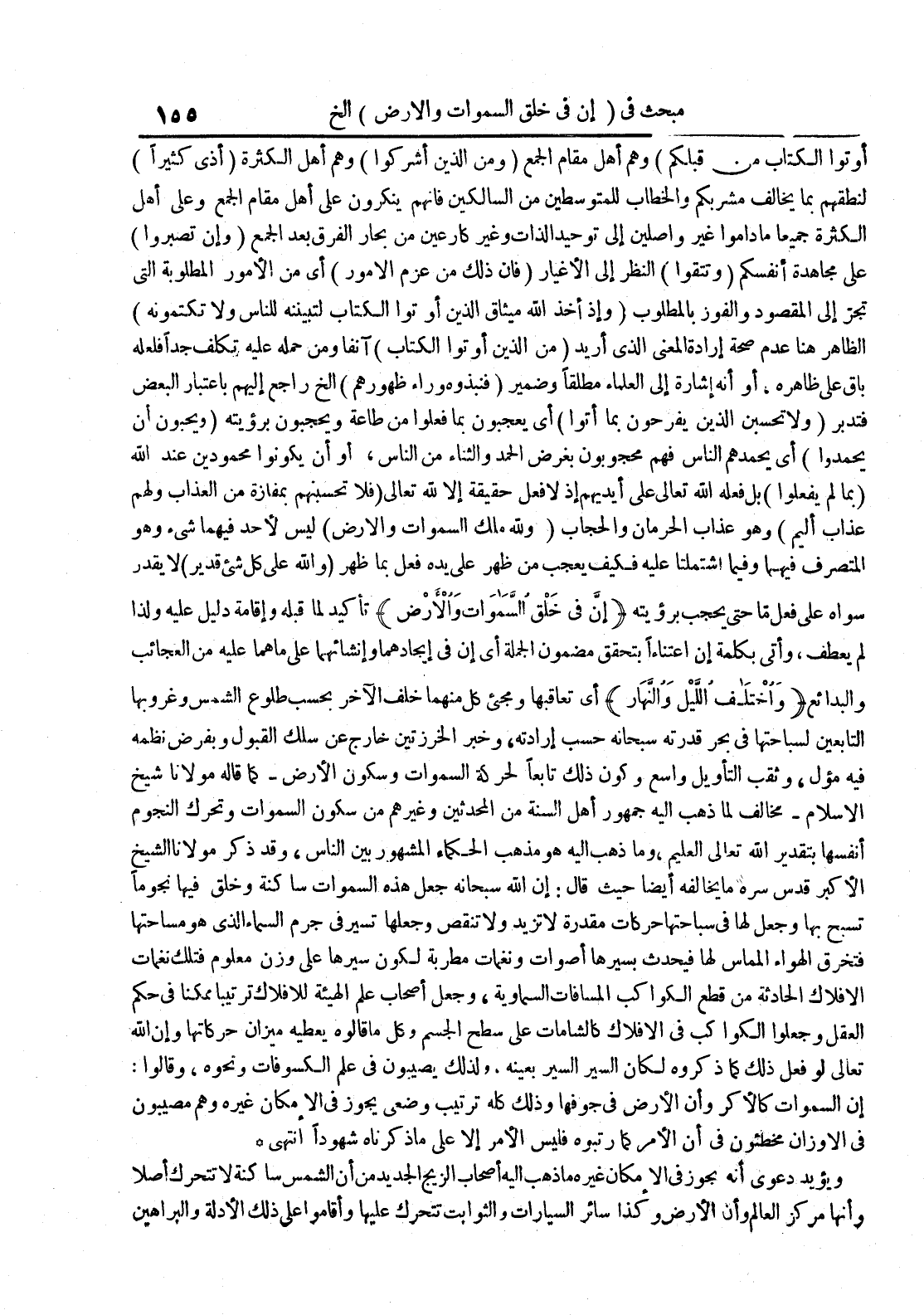 أوتوا الكتاب من قبلكم وهم أهل مقام الجمع ومن الذين أشركوا وهم أهل مقام الجمع ومن الذين أشركوا وهم أهل الكثرة أذى كثيرا لنطقهم بما يخالف مشربكم والخطاب للمتوسطين من السالكين فإنهم ينكرون على أهل مقام الجمع وعلى أهل الكثرة جميعا ما داموا غير واصلين إلى توحيد الذات وغير كارعين من بحار الفرق بعد الجمع وإن تصبروا على مجاهدة أنفسكم وتتقوا النظر إلى الأغيار فإن ذلك من عزم الأمور أي من الأمور المطلوبة التي تجر إلى المقصود والفوز بالمطلوب وإذ أخذ الله ميثاق الذين أوتوا الكتاب لتبيننه للناس ولا تكتمونه الظاهر هنا عدم صحة إرادة المعنى الذي أريد من الذين أوتوا الكتاب آنفا ومن حمله عليه تكلف جدا فلعله باق على ظاهره أو أنه إشارة إلى العلماء مطلقا وضمير فنبذوه وراء ظهورهم إلخ راجع إليهم بإعتبار البعض فتدبر ولا تحسبن الذين يفرحون بما أتوا أي يعجبون بما فعلوا من طاعة ويحجبون برؤيته ويحبون أن يحمدوا أي يحمدهم الناس فهم محجوبون بغرض الحمد والثناء من الناس أو أن يكونوا محمودين عند الله بما لم يفعلوا بل فعله الله تعالى على أيديهم إذ لا فعل حقيقة إلا لله تعالى فلا تحسبنهم بمفازة من العذاب ولهم عذاب أليم وهو عذاب الحرمان والحجاب ولله ملك السموات والأرض ليس لأحد فيهما شيء وهو المتصرف فيهما وفيما أشتملنا عليه فكيف يعجب من ظهر على يده فعل بما ظهر والله على كل شيء قدير لا يقدر سواه على فعل ما حتى يحجب برؤيته إن في خلق السموات والأرض تأكيد لما قبله وإقامة دليل عليه ولذا لم يعطف وأتى بكلمة إن إعتناءا بتحقق مضمون الجملة أي إن في إيجادهما وإنشائهما على ما هما عليه من العجائب والبدائع وأختلاف الليل والنهار أي تعاقبها ومجيء كل منهما خلف الآخر بحسب طلوع الشمس وغروبها التابعين لسباحتها في بحر قدرته سبحانه حسب إرادته وخبر الخرزتين خارج عن سلك القبول وبفرض نظمه فيه مؤل وثقب التأويل واسع وكون ذلك تابعا لحركة السموات وسكون الأرضكما قاله مولانا شيخ الإسلاممخالف لما ذهب إليه جمهور أهل السنة من المحدثين وغيرهم من سكون السموات وتحرك النجوم أنفسها بتقدير الله تعالى العليم وما ذهب إليه هو مذهب الحكماء المشهور بين الناس وقد ذكر مولانا الشيخ الأكبر قدس سره ما يخالفه أيضا حيث قال : إن الله سبحانه جعل هذه السموات ساكنة وخلق فيها نجوما تسبح بها وجعل لها في سباحتها حركات مقدرة لا تزيد ولا تنقص وجعلها تسير في جرم السماء الذي هو مساحتها فتخرق الهواء المماس لها فيحدث بسيرها أصوات ونغمات مطربة لكون سيرها على وزن معلوم فتلك نغمات الأفلاك الحادثة من قطع الكواكب المسافات السماوية وجعل أصحاب علم الهيئة للأفلاك ترتيبا ممكنا في حكم العقل وجعلوا الكواكب في الأفلاك كالشامات على سطح الجسم وكل ما قالوه يعطيه ميزان حركاتها وإن الله تعالى لو فعل ذلك كما ذكروه لكان السير السير بعينه ولذلك يصيبون في علم الكسوفات ونحوه وقالوا : إن السموات كالأكر وأن الأرض في جوفها وذلك كله ترتيب وضعي يجوز في الإمكان غيره وهم مصيبون في الأوزان مخطئون في أن الأمر كما رتبوه فليس الأمر إلا على ما ذكرناه شهودا إنتهى
