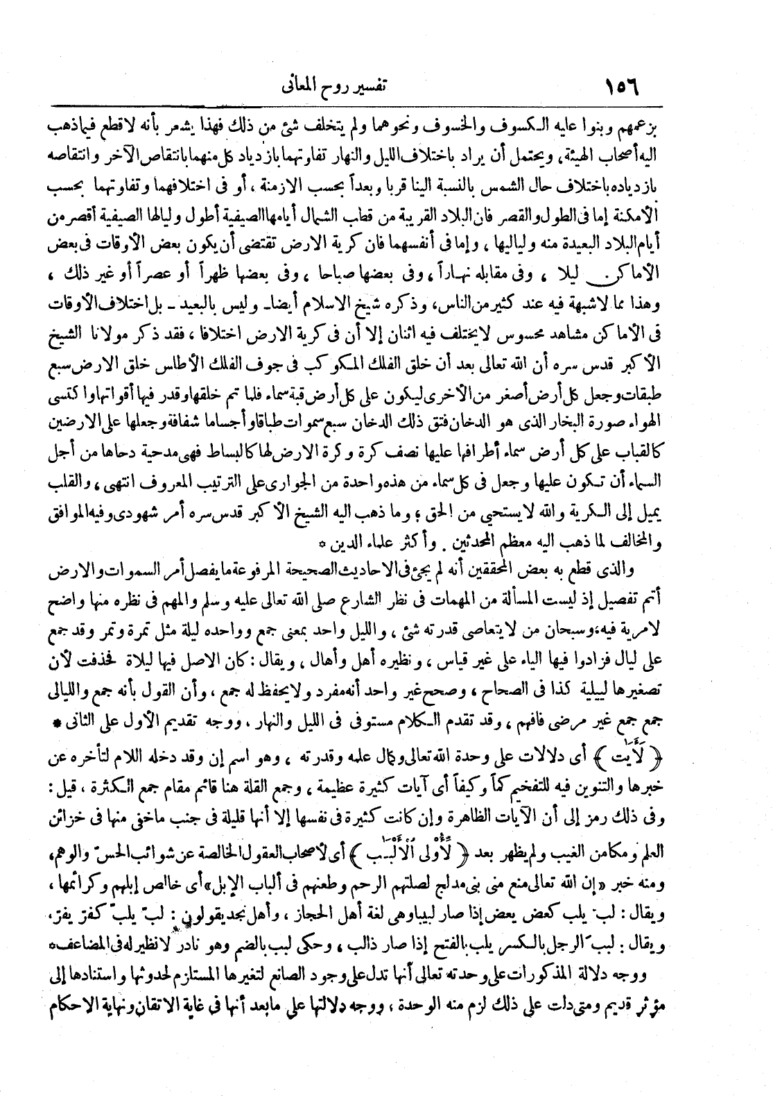 بزعمهم وبنوا عليه الكسوف والخسوف ونحوهما ولم يتخلف شيء من ذلك فهذا يشعر بأنه لا قطع فيما ذهب إليه أصحاب الهيئة ويحتمل أن يراد بإختلاف الليل والنهار تفاوتهما بإزدياد كل منهما بإنتقاص الآخر وإنتقاصه بإزدياده بإختلاف حال الشمس بالنسبة إلينا قربا وبعدا بحسب الأزمنة أو في إختلافهما وتفاوتهما بحسب الأمكنة إما في الطول والقصر فإن البلاد القريبة من قطب الشمال أيامها الصيفية أطول وليالها الصيفية أقصر من أيام البلاد البعيدة منه ولياليها وإما في أنفسهما فإن كرية الأرض تقتضي أن يكون بعض الأوقات في بعض الأماكن ليلا وفي مقابله نهارا وفي بعضها صباحا وفي بعضها ظهرا أو عصرا أو غير ذلك وهذا مما لا شبهة فيه عند كثير من الناس وذكره شيخ الإسلام أضاوليس بالبعيدبل إختلاف الأوقات في الأماكن مشاهد محسوس لا يختلف فيه إثنان إلا أن في كرية الأرض إختلافا فقد ذكر مولانا الشيخ الأكبر قدس سره أن الله تعالى بعد أن خلق الفلك المكوكب في جوف الفلك الأطلس خلق الأرض سبع طبقات وجعل كل أرض أصغر من الأخرى ليكون على كل أرض قبة سماء فلما تم خلقها وقدر فيها أقواتها وأكتسى الهواء صورة البخار الذي هو الدخان فتق ذلك الدخان سبع سموات طباقا وأجساما شفافة وجعلها على الأرضين كالقباب على كل أرض سماء أطرافها عليها نصف كرة وكرة الأرض لها كالبساط فهي مدحية دحاها من أجل السماء أن تكون عليها وجعل في كل سماء من هذه واحدة من الجواري على الترتيب المعروف إنتهى والقلب يميل إلى الكرية والله لا يستحيي من الحق وما ذهب إليه الشيخ الأكبر قدس سره أمر شهودي وفيه الموافق والمخالف لما ذهب إليه معظم المحدثين وأكثر علماء الدين