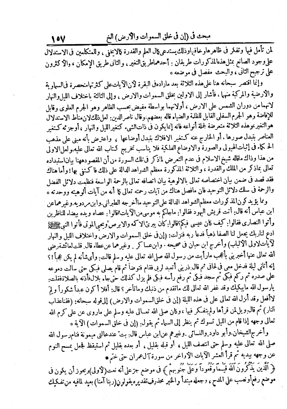 ومما يؤيد كون المذكورات معظم الشواهد الدالة على التوحيد ماأخرجه الطبراني وإبن مردويه وغيرهما عن إبن عباس أنه قال : أتت قريش اليهود فقالوا : ما جاءكم به موسى من الآيات قالوا : عصاه ويده بيضاء للناظرين وأتوا النصارى فقالوا : كيف كان عيبسى فيكم قالوا : كان يبريء الأكمه والأبرص ويحيى الموتى فأتوا النبي أدع لنا ربك يجعل لنا الصفا ذهبا فدعا ربه فنزلت : إن في خلق السموات والأرض وإختلاف الليل والنهار لآيات لأولي الألباب وأخرج إبن حبان في صحيحه وإبن عساكر وغيرهما عن عطاء قال قلت لعائشة رضي الله تعالى عنها أخبريني بأعجب ما رأيت من رسول الله صلى الله تعالى عليه وسلم قالت : وأي شأنه لم يكن عجبا ! إنه أتاني ليلة فدخل معي في لحافي ثم قال ذريني أتعبد لربي فقام فتوضأ ثم قام يصلي فبكى حتى سالت دموعه على صدره ثم ركع فبكى ثم سجد فبكى ثم رفع رأسه فبكى فلم يزل كذلك حتى جاء بلال فأذنه بالصلاة فقلت : يارسول الله ما يبكيك وقد غفر الله تعالى لك ما تقدم من ذنبك وما تأخر قال : أفلا أكون عبدا شكورا ولم لا أفعل وقد أنزل الله تعالى علي في هذه الليلة إن في خلق السموات والأرض إلى قوله سبحانه : فقنا عذاب النار ثم قال : ويل لمن قرأها ولم يتفكر فيها وكان صلى الله تعالى عليه وسلم على ما روى عن علي كرم الله تعالى وجهه إذا قام من الليل تسوك ثم ينظر إلى السماء ثم يقول : إن في خلق السموات الآية