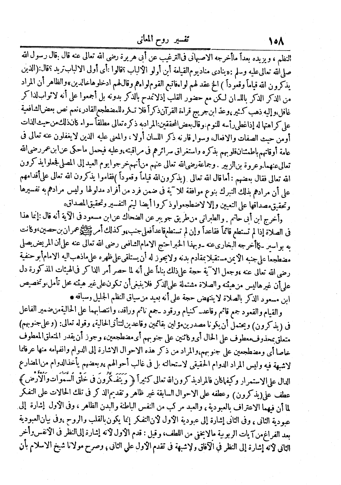 النظم ويزيده بعدا ماأخرجه الأصبهاني في الترغيب عن أبي هريرة رضي الله تعالى عنه قال : قال رسول الله صلى الله تعالى عليه وسلم : ينادي مناد يوم القيامة أين أولو الألباب قالوا : أي أولي الألباب تريد قال : الذين يذكرون الله قياما وقعودا إلخ عقد لهم لواء فأتبع القوم لواءهم وقال لهم أدخلوها خالدين والظاهر أن المراد من الذكر الذكر باللسان لكن مع حضور القلب إذ لا تمدح بالذكر بدونه بل أجمعوا على أنه لا ثواب لذاكر غافل وإليه ذهب كثير وعد إبن جريج قراءة القرآن ذكرا فلا تكره للمضطجع القادر نعم نص بعض الشافعية على كراهتها له إذا غطى رأسه للنوم وقال بعض المحققين : المراد به ذكره تعالى مطلقا سواء كان ذلك من حيث الذات أو من حيث الصفات والأفعال وسواء قارنه ذكر اللسان أولا والمعنى عليه الذين لا يغفلون عنه تعالى في عامة أوقاتهم بإطمئنان قلبوهم بذكره وأستغراق سرائرهم في مراقبته وعليه فيحمل ما حكى عن إبن عمر رضي الله تعالى عنهما وعروة بن الزبير وجماعة رضي الله تعالى عنهم من أنهم خرجوا يوم العيد إلى المصلى فجعلوا يذكرون الله تعالى فقال بعضهم : أما قال الله تعالى يذكرون الله قياما وقعودا فقاموا يذكرون الله تعالى على أقدامهم على أن مرادهم بذلك التبرك بنوع موافقة للآية في ضمن فرد من أفراد مدلولها وليس مرادهم به تفسيرها وتحقيق مصداقها على التعيين وإلا لأضطجعوا وذكروا أيضا ليتم التفسير وتحقيق المصداق