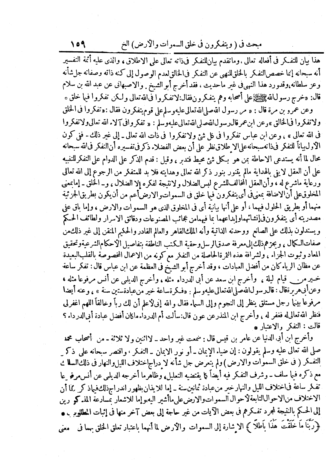 وأخرج إبن أبي الدنيا عن عامر بن قيس قال : سمعت غير واحدلا إثنين ولا ثلاثةمن أصحاب محمد صلى الله تعالى عليه وسلم يقولون : إن ضياء الإيمانأو نور الإيمانالتفكر وأقتصر سبحانه على ذكر التفكر في خلق السموات والأرض ولم يتعرض جل شأنه لإدراج إختلاف الليل والنهار في ذلك السلك مع ذكره فيما سلف وشرف التفكر فيه أيضا كما يقتضيه التعليل وظاهر ما أخرجه الديلمي عن أنس مرفوعا تفكر ساعة في إختلاف الليل والنهار خير من عبادة ثمانين سنةإما للإيذان بظهور إندراج ذلك فيما ذكر لما أن الإختلاف من الأحوال التابعة لأحوال السموات والأرض على ماأشير إليه وإما للإشعار بمسارعة المذكورين إلى الحكم بالنتيجة لمجرد تفكرهم في بعض الآيات من غير حاجة إلى بعض آخر منها في إثبات المطلوب