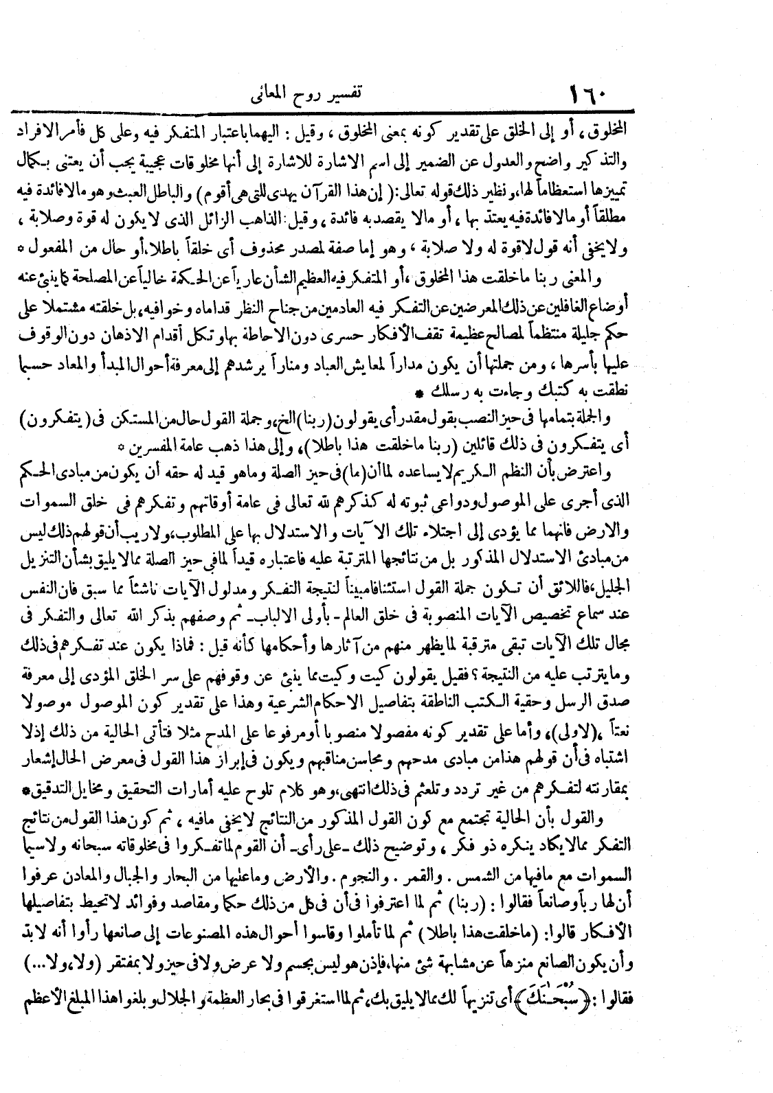 والمعنى ربنا ما خلقت هذا المخلوق أو المتفكر فيه العظيم الشأن عاريا عن الحكمة خاليا عن المصلحة كما ينبيء عنه أوضاع الغافلين عن ذلك المعرضين عن التفكر فيه العادمين من جناح النظر قداماه وخوافيه بل خلقته مشتملا على حكم جليلة منتظما لمصالح عظيمة تقف الأفكار حسرى دون الإحاطة بها وتكل أقدام الأذهان دون الوقوف عليها بأسرها ومن جملتها أن يكون مدارا لمعايش العباد ومنارا يرشدهم إلى معرفة أحوال المبدأ والمعاد حسبما نطقت به كتبك وجاءت به رسلك