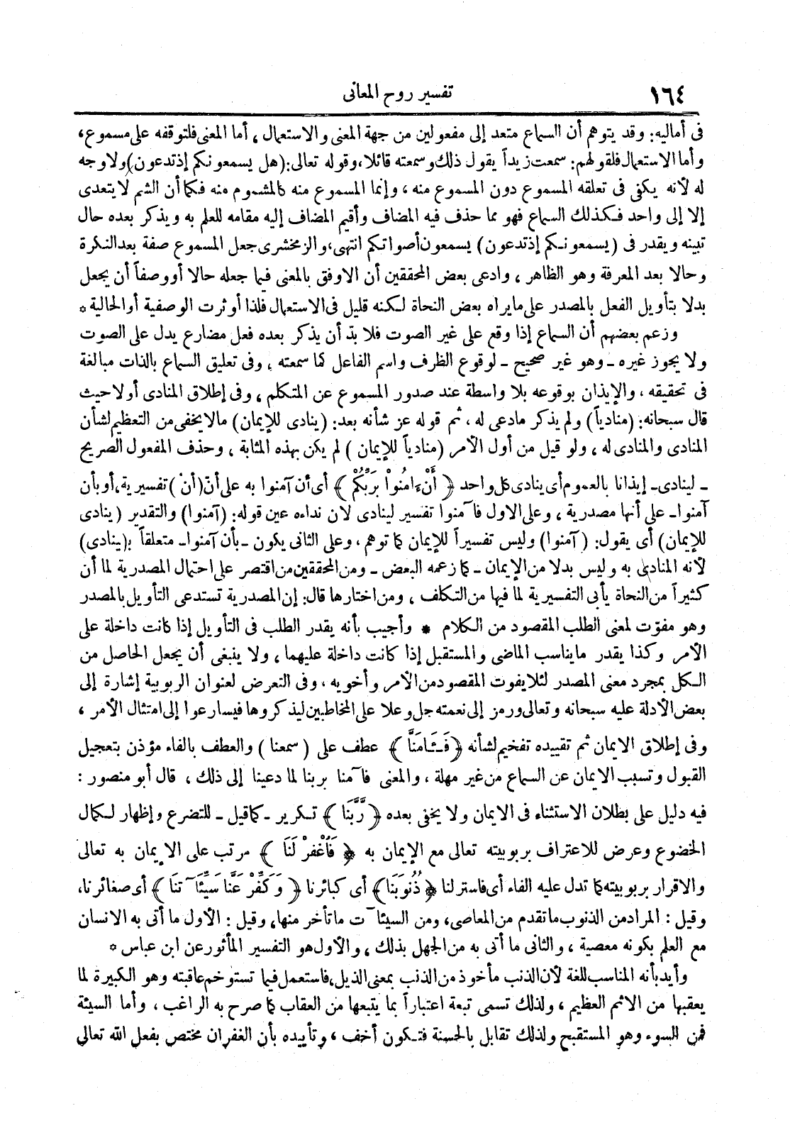 وزعم بعضهم أن السماع إذا وقع على غير الصوت فلا بد أن يذكر بعده فعل مضارع يدل على الصوت ولا يجوز غيرهوهو غير صحيحلوقوع الظرف وأسم الفاعل كما سمعته وفي تعليق السماع بالذات مبالغة في تحقيقه والإيذان بوقوعه بلا واسطة عند صدور المسموع عن المتكلم وفي إلاق المنادي أولا حيث قال سبحانه : مناديا ولم يذكر ما دعى له ثم قوله عز شأنه بعد : ينادي للإيمان مالا يخفى من التعظيم لشأن المنادي والمنادي له ولو قيل من أول الأمر مناديا للإيمان لم يكن بهذه المثابة وحذف المفعول الصريح ليناديإيذانا بالعموم أي ينادي كل واحد أن آمنوا بربكم أي أن آمنوا به على أن أن تفسيرية أو بأن آمنواعلى أنها مصدرية وعلى الأول فآمنوا تفسير لينادي لأن نداءه عين قوله : آمنوا والتقدير ينادي للإيمان أي يقول : آمنوا وليس تفسيرا للإيمان كما توهم وعلى الثاني يكونبأن آمنوامتعلقا ب ينادي لأنه المنادى به وليس بدلا من الإيمانكما زعمه البعضومن المحققين من أقتصر على إحتمال المصدرية لما أن كثيرا من النحاة يأبى التفسيرية لما فيها من التكلف ومن أختارها قال : إن المصدرية تستدعي التأويل بالمصدر وهو مفوت لمعنى الطلب المقصود من الكلام