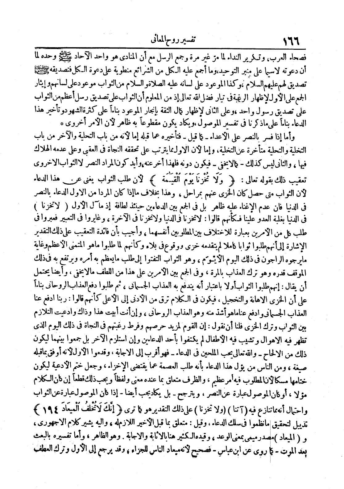 وأما إذا فسر بالنصر على الأعداءكما قيلفتأخيره عما قبله إما لأنه من باب التحلية والآخر من باب التخلية والتحلية متأخرة عن التخلية وإما لأن الأول مما يترتب على تحقه النجاة في العقبى وعلى عدمه الهلاك فيها والثاني ليس كذلككما لا يخفىفيكون دونه فلهذا أخر عنه وأيد كون المراد النصر لا الثواب الأخروي تعقيب ذلك بقوله تعالى : ولا تخزنا يوم القيامة لأن طلب الثواب يغني عن هذا الدعاء لأن الثواب متى حصل كان الخزي عنهم بمراحل وهذا بخلاف ما إذا كان المراد من الأول الدعاء بالنصر في الدنيا فإن عدم الإغناء عليه ظاهر بل في الجمع بين الدعاءين حينئذ لطافة إذ مال الأول لا تخزنا في الدنيا بغلبة العدو علينا فكأنهم قالوا : لا تخزنا في الدنيا ولا تخزنا في الآخرة وغايروا في التعبير فعبروا في طلب كل من الأمرين بعبارة للإختلاف بين المطلوبين أنفسهما وأجيب بأن فائدة التعقيب على ذلك التقدير لإشارة إلى أنهم طلبوا ثوابا كاملا لم يتقدمه خزي ووقوع في بلاء وكأنهم لما طلبوا ما هو المتمني الأعظم وغاية ما يرجوه الراجون في ذلك اليوم الأيوم وهو الثواب ألتفتوا إلى طلب ما يعظم به أمره ويرتفع به في ذلك لموقف قدره وهو ترك العذاب بالمرة وفي الجمع بين الأمرين على هذا من اللطف ما لا يخفى وأيضا يحتمل أن يقال : إنهم طلبوا الثواب أولا بإعتبار أنه يندفع به العذاب الجسماني ثم طلبوا دفع العذاب الروحاني بناءا على أن الخزي الإهانة والتخجيل فيكون في الكلام ترق من الأدنى إلى الأعلى كأنهم قالوا : ربنا أدفع عنا العذاب الجسماني وأدفع عنا ما هو أشد منه وهو العذاب الروحاني وإن أنت أبيت هذا وذاك وأدعيت التلازم بين الثواب وترك الخزي فلنا أن نقول : إن القوم لمزيد حرصهم وفرط رغبتهم في النجاة في ذلك اليوم الذي تظهر فيه الأهوال وتشيب فيه الأطفال لم يكتفوا بأحد الدعاءين وإن أستلزم الآخر بل جمعوا بينهما ليكون ذلك من الإلحاحوالله تعالى يحب الملحين في الدعاءفهوأقرب إلى الإجابة وقدموا الأول لأنه أوفق بما قبله صيغة ومن الناس من يؤل هذا الدعاء بأنه طلب العصمة عما يقتضي الإخزاء وجعل ختم الأدعية ليكون ختامها مسكا لأن المطلوب فيه أمر عظيم والظرف متعلق بما عنده معنى ولفظا ويجب ذلك قطعا إن كان الكلام مؤلا أو كان الموصول عبارة عن النصر ويترجحبل يكاد يجب أيضاإذا كان الموصول عبارة عن الثواب وإحتمال أنه مما تنازع فيه آتنا ولا تخزنا على ذلك التقدير هو كما ترى إنك لا تخلف الميعاد 491 تذييل لتحقيق ما نظموا في سلك الدعاء وقيل : متعلق بما قبل الأخير اللازم له وإليه يشير كلام الأجهوري و الميعاد مصدر ميمي بمعنى الوعد وقيده الكثير هنا بالإثابة والإجابة وهو الظاهر وأما تفسيره بالبعث بعد الموتكما روى عن إبن عباسفصحيح لأنه ميعاد الناس للجزاء وقد يرجع إلى الأول وترك العطف