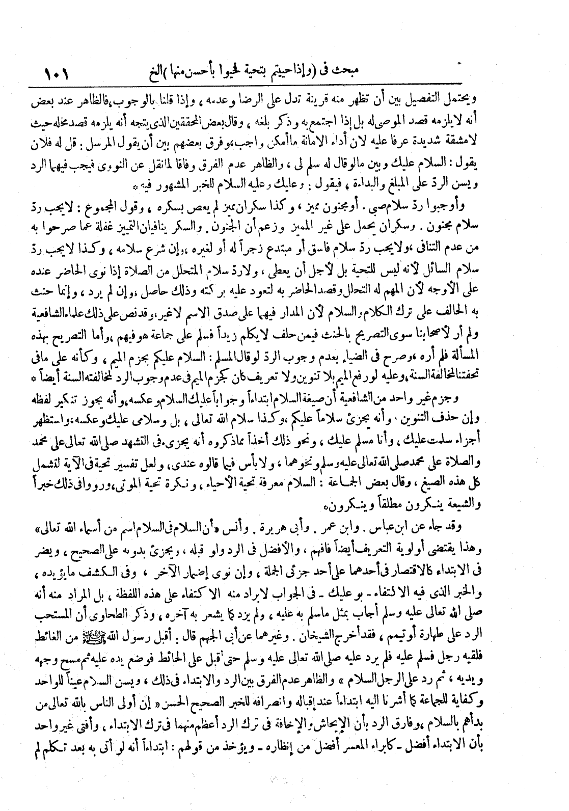 وقد جاء عن ابن عباس وابن عمر وأبي هريرة وأنس أن السلام فى السلام اسم من أسماء الله تعالى وهذا يقتضي أولوية التعريف أيضا فافهم والأفضل فى الرد واو قبله ويجزىء بدونه على الصحيح ويضر فى الابتداء كالاقتصار فى أحدهما على أحد جزئى الجملة وان نوى إضمار الآخر وفى الكشف مايؤيده والخبر الذي فيه الاكتفاء بو عليك فى الجواب لايراد منه الاكتفاء على هذه اللفظة بل المراد منه أنه صلى الله تعالى عليه وسلم أجاب بمثل ماسلم به عليه ولم يزد كما يشعر به آخره وذكر الطحاوى أن المستحب الرد على طهارة أو تيمم فقد أخرج الشيخان وغيرهما عن أبى الجهم قال : أقبل رسول الله صلى الله عليه و سلم من الغائط فلقيه رجل فسلم عليه فلم يرد عليه صلى الله تعالى عليه وسلم حتى أقبل على الحائط فوضع يده عليه ثم مسح وجهه ويديه ثم رد على الرجل السلام والظاهر عدم الفرق بين الرد والابتداء في ذلك ويسن السلام عينا للواحد وكفاية للجماعة كما أشرنا اليه إبتداءا عند إقباله وانصرافه للخبر الصحيح الحسن إن إولى الناس بالله تعالى من بدأهم بالسلام وفارق الرد بأن الإيحاش والاخافة فى ترك الرد أعظم منهما فى ترك الابتداء وأفتى غير واحد بأن الابتداء أفضل كابراء المعسر أفضل من إنظاره ويؤخذ من قولهم : ابتداءا أنه لو أتى به بعد تكلم لم