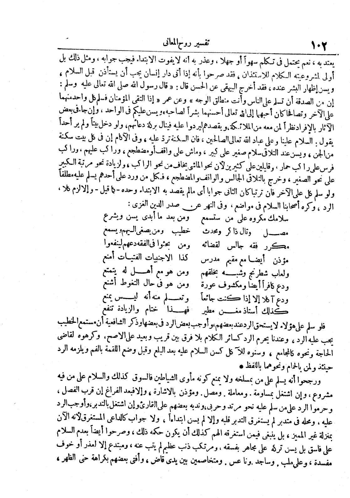 يعتد به نعم يحتمل فى تكلم سهوا أو جهلا وعذر به أنه لايفوت الابتداء فيجب جوابه ومثل ذلك بل أولى لمشروعيته الكلام للاستئذان فقد صرحوا بأنه اذا أتى دار انسان يجب أن يستأذن قبل السلام ويسن إظهار البشر عنده فقد أخرج البيهقى عن الحسن قال : قال رسول الله صلى الله عليه و سلم : ان من الصدفة أن تسلم على الناس وأنت منطلق الوجه وعن عمر إذا التقى المؤمنان فسلم كل واحد منهما على الآخر وتصافحا كان أحبهما الى الله تعالى أحسنهما بشرا لصاحبه ويسن عليكم فى الواحد وان جاء فى بعض الآثار بالافراد نظرا لمن معه من الملائكة ويقصدهم ليردوا عليه فينال بركة دعائهم ولو دخل بيتا ولم ير أحدا يقول السلام علينا وعلى عباد الله تعالى الصالحين فان السكنة ترد عليه وفى الآكام ان فى كل بيت سكنة من الجن ويسن عند التلاقى سلام صغير على كبير وماشى على واقف أو مضطجع وراكب عليهم وراكب فرس على راكب حمار وقليلن على كثيرين لأن نحو الماشى يخاف من نحو الراكب ولزيادة مرتبة الكبير على نحو الصغير وخرج بالتلاقى الجالس والواقف والمضطجع فكل من ورد على أحدهم يسلم عليه مطلقا ولو سلم كل على الآخر فان ترتبا كان الثانى جوابا أى مالم يقصد به الابتداء وحده كما قيل والإلزام كلا الرد وكره أصحابنا السلام فى مواضع وفى النهر عن صدر الدين الغزى : سلامك مكروه على من ستسمع ومن بعد ماأبدى يسن ويشرع مصل وتال ذاكر ومحدث خطيب ومن يصغى اليهم ويسمع مكرر فقه جالس لقضائه ومن بحثوا فى الفقه دعهم لينفعوا مؤذن أيضا مع مقيم مدرس كذا الاجنبيات الفتيات أمنع ولعاب شطرنج وشبه بخلقهم ومن هو مع أهل له يتمتع ودع كافر أيضا ومكشوف عورة ومن هو فى حال التغوط أشنع ودع آكلا إلا إذا كنت جائعا وتعلم منه أنه ليس يمنع كذلك أستاذ مغن مطير فهذا ختام والزيادة تنفع فلو سلم على هؤلاء لايستحق الرد عند بعضهم وأوجب بعض الرد في بعضها وذكر الشافعية أن مستمع الخطيب يجب عليه الرد وعندنا يحرم كاسائر الكلام بلا فرق بين قريب وبعيد على الاصح وكرهوه لقاضى الحاجة ونحوه كالمجامع وسنوه للآكل كسن السلام عليه بعد البلع وقبل وضع اللقمة بالفم ويلزمه الرد حينئذ ولمن بالحمام ونحوهما باللفظ