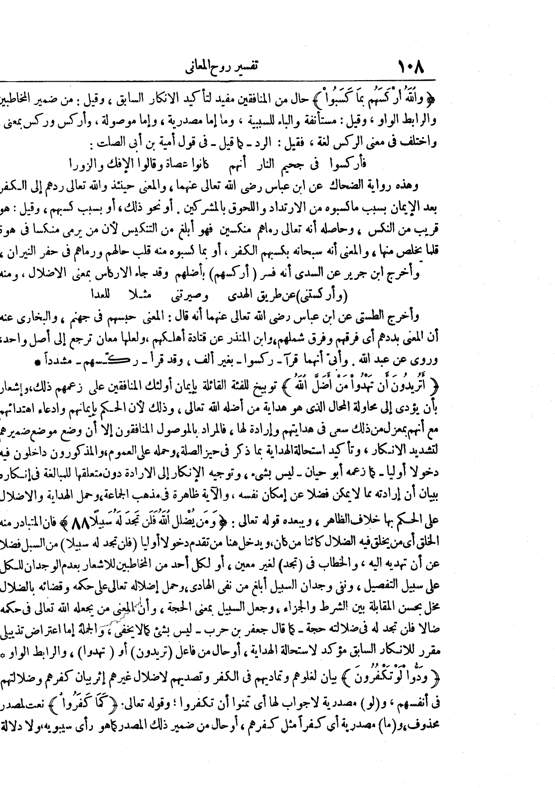 والله اركسم بما كسبوا حال من المنافقين مفيد لتأكيد الانكار السابق وقيل : من ضمير المخاطبين والربط الواو وقيل : مستأنفة والباء سببية وما إما مصدرية وإما موصولة وأركس وركس بمعنى واختلف فى معنى الركس : الرد كما قيل في قول أمية بن أبي الصلت : فأركسوا في جحيم النار أنهم كانوا عصاة وقالوا الافك والزورا وهذه رواية الضحاك عن ابن عباس رضى الله تعالى عنهما والمعنى حينئذ والله تعالى ردهم الى الكفر بعد الايمان بسبب ماكسبوه من الارتداد واللحوق بالمشركين أو نحو ذلك أو بسبب كسبهم وقيل : هو قريب من النكس وحاصله أنه تعالى رماهم منكسين فهو أبلغ من التنكيس لأن من يرمى منكسا فى هوة قلما يخلص منها والمعنى أنه سبحانه بكسبهم الكفر أو بماكسبوه منه قلب حالهم ورماهم فى حفر النيران وأخرج ابن جرير عن السدى أنه فسر أركسهم بأضلهم وقد جاء الاركاس بمعنى الاضلال ومنه وأركستني عن طريق الهدى وصيرتنى مثلا للعدا وأخرج الطستى عن ابن عباس رضى الله تعالى عنهما أنه قال : المعنى حبسهم فى جهنم والبخارى عنه أن المعنى ببدهم أى فرقهم شملهم وابن المنذر عن قتادة أهلكهم ولعلها معان ترجع الى أصل واحد وروى عن عبد الله وأبى أنهما قرآ ركسوا بغير ألف ركستهم مشددا