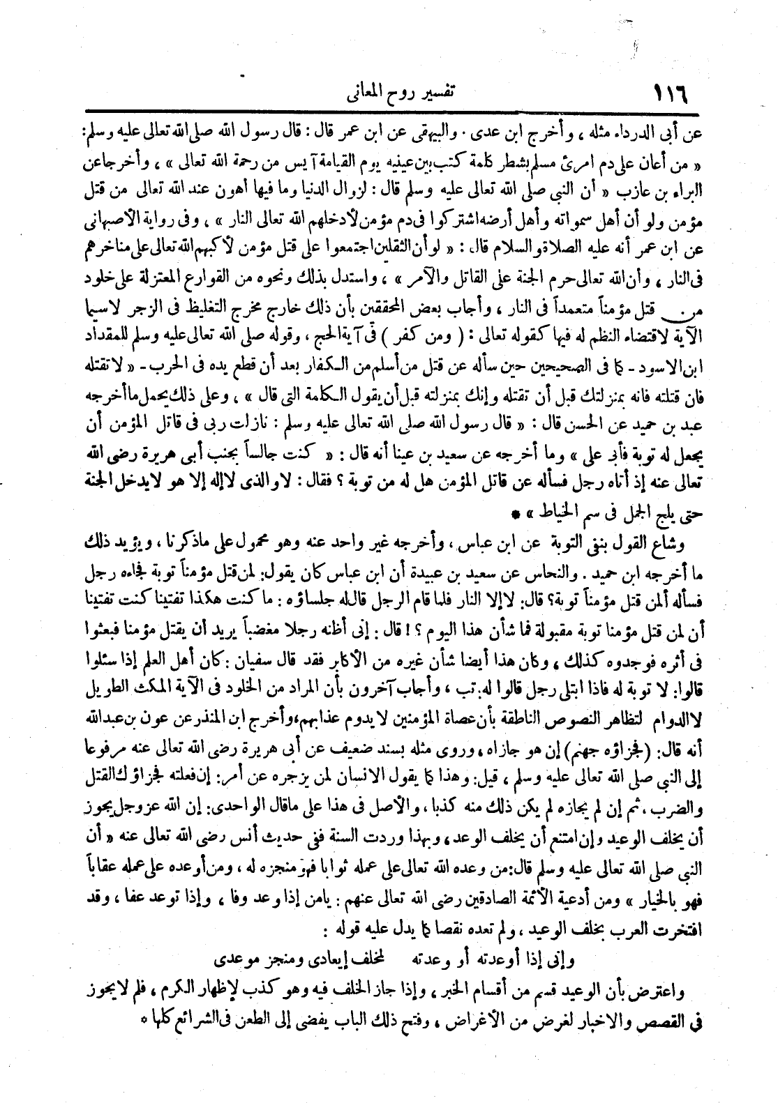 وشاع القول بنفى التوبة عن ابن عباس وأخرجه غير واحد عنه وهو محمول على ماذكرنا ويؤيد ذلك ماأخرجه ابن حميد والنحاس عن سعيد بن عبيدة أن ابن عباس كان يقول : لمن قتل مؤمنا توبة فجاءه رجل فسأله ألمن قتل مؤمنا توبة قال : لا إلا النار فلما قام الرجل قال له جلساؤه : ماكنت هكذا تفتينا كنت تفتينا أن لمن قتل مؤمنا توبة مقبولة فما شأن هذا اليوم قال : إنى أظنه رجلا مغضبا يريد أن يقتل مؤمنا فبعثوا فى أثره فوجدوه كذلك وكان هذا أيضا شأن غيره من الأكابر فقد قال سفيان : كان أهل العلم إذا سئلوا قالوا : لاتوبة له فاذا ابتلى رجل قالوا له تب وأجاب آخرون بأن المراد من الخلود فى الآية المكث الطويل لا الدوام لتظاهر النصوص الناطقة بأن عصاة المؤمنين لايدوم عذابهم وأخرج ابن النذر عن عون بن عبد الله أنه قال : فجزاؤه جهنم إن هو جازاه وروى مثله بسند ضعيف عن أبى هريرة رضى الله تعالى عنه مرفوعا الى النبى صلى الله عليه و سلم قيل وهذا كما يقول الانسان لمن يزجره عن أمر : إن فعلته فجزاؤك القتل والضرب ثم ان لم يجازه لم يكن ذلك منه كذبا ولأصل فى هذا على ماقال الواحدى : إن الله عز و جل يجوز أن يخلف الوعيد وإن امتنع أن يحبف الوعد وبهذا وردت السنة ففى حديث أنس رضى الله تعالى عنه أن النبى صلى الله عليه و سلم قال : من وعده الله تعالى على عمله ثوابا فهو منجزه له ومن أوعده على عمله عقابا فهو بالخيار ومن أدعية الأئمة الصادقين رضى الله تعالى عنهم : يامن اذا وعد وفا واذا توعد عفا وقد افتخرت العرب بحلف الوعيد ولم تعده نقصا كما يدل عيه قوله : وأنى إذا أوعدته أو وعدته لمخلف إيعادى ومنجز موعدى واعترض بأن الوعيد قسم من أقسام الخبر وإذا جاز الخلف فيه وهو كذب لإظهار الكرم فلم لايجوز فى القصص والاخبار لغرض من الأغراض وفتح ذلك الباب يفضى الى الطعن فى الشرائع كلها