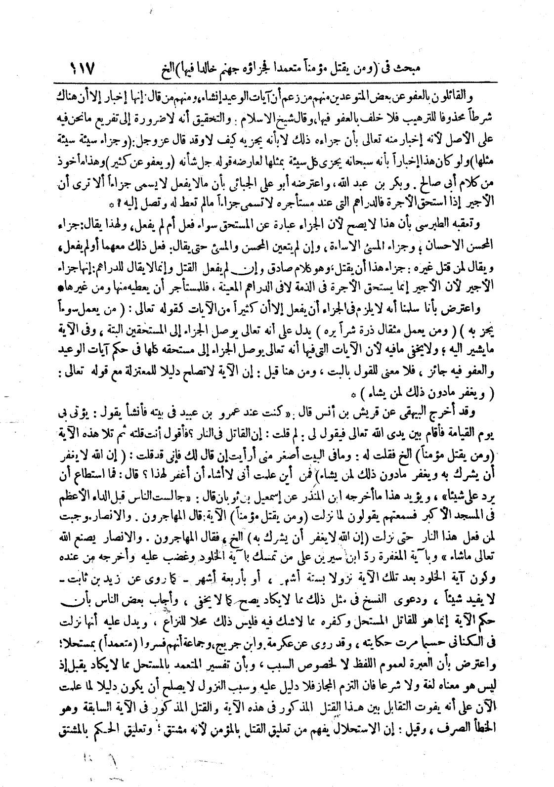 وقد أخرج البيهقى عن قريش بن أنس قال كنت عند عمرو بن عبيد فى بيته فأنشأ يقول : يؤتى بي يوم القيامة فأقام بين يدى الله تعالى فيقول لى : لم قلت : إن القاتل فى النار فأقول أنت قلته ثم تلا هذه الآية ومن يقتل مؤمنا الخ فقلت له : ومافى البيت أصغر منى أرأيت إن قال لك فانى قد قلت : إن الله لايففر أن يشرك به ويغفر مادون ذلك لمن يشاء فمن أين علمت أنى لاأشاء أن أغفر لهذا قال : فما استطاع أن يرد على شيئا ويؤيد هذا ما أخرجه ابن المنذر عن اسمعيل بن ثوبان قال : جالست الناس قبل الداء الأعظم فى المسجد الأكبر فسمعتهم يقولون لما نزلت ومن يقتل مؤمنا الآية : قال المهاجرون والانصار وجبت لمن فعل هذا النار ختى نزلت إن الله لايغفر أن يشرك به الخ فقال المهاجرون والانصار يصنع الله تعالى ماشاء وبآية المغفرة رد ابن سيرين على من تمسك بآية الخلود وغضب عليه وأخرجه من عنده وكون آية الخلود بعد تلك الآية نزولا بستة أشهر أو بأربعة أشهر كما روى عن زيد بن ثابت لايفيد شيئا ودعوى النسخ فى مثل ذلك مما لايكاد يصح كما لايخفى وأجاب بعض الناس بأن حكم الآية إنما هو للقاتل المستحل وكفره مما لاشك فيه فليس ذلك محلا للنزاع ويدل عليه أنها نزلت فى الكنانى حسبما مرت حكايته وقد روى عن عكرمة وابن جريج وجماعة أنهم فسروا متعمدا بمستحلا واعترض بأن العبرة لعموم اللفظ لا لخصوص السبب وبأن تفسير المتعمد بالمستحل مما لايكاد يقبل إذ ليس هو معناه لغة ولاشرعا فان التزم المجاز فلا دليل عليه وسبب النزول لايصلح أن يكون دليلا لما علمت الآن على أنه يفوت التقابل بين هذا القتل المذكور فى هذه الآية والقتل المذكور فى الآية السابقة وهو الخطأ الصرف وقيل إن الاستحلال يفهم من تعليق القتل بالمؤمن لأنه مسشتق وتعليق الحكم بالمشتق