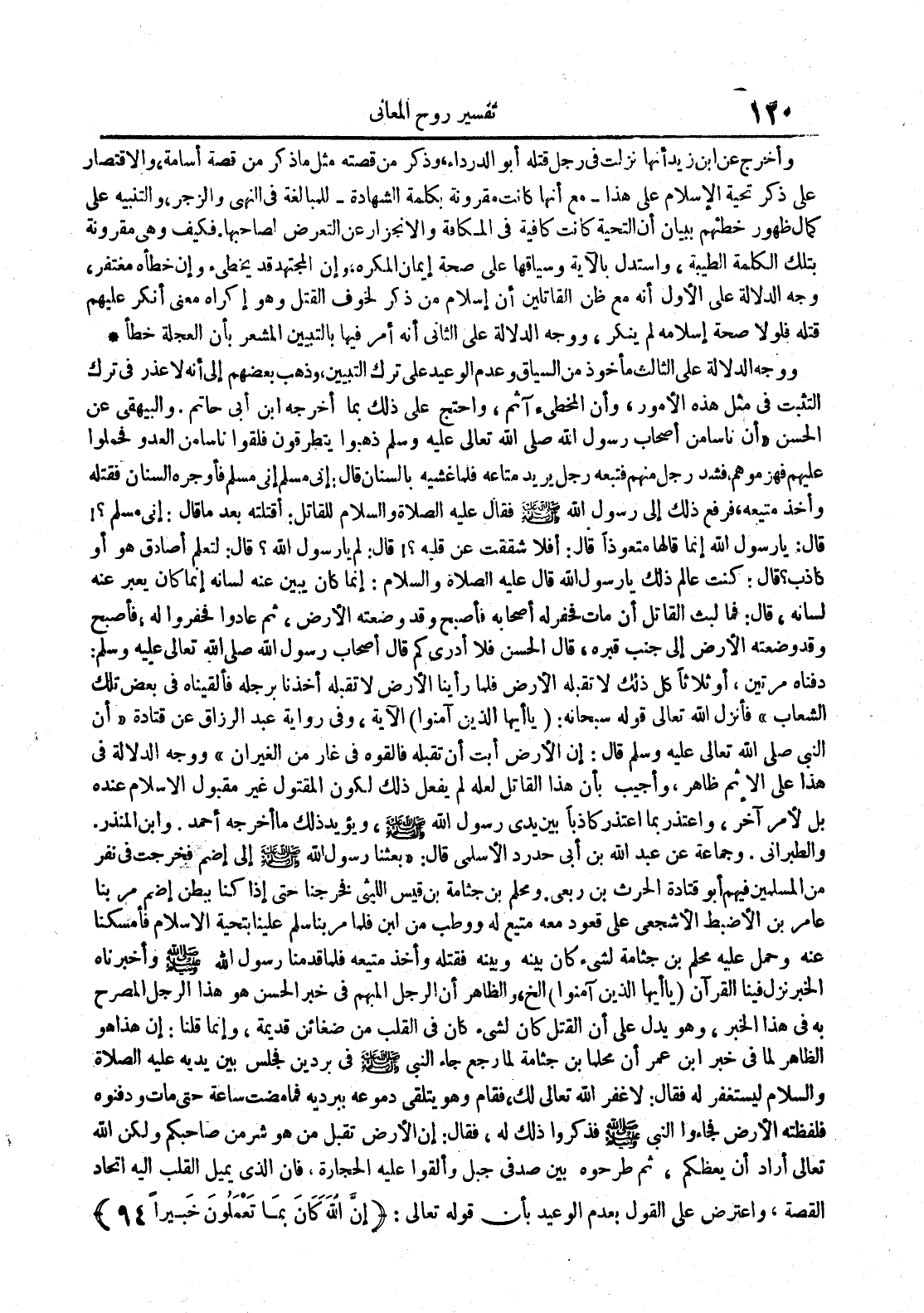 ووجه الدلالة على الثالث مأخوذ من السياق وعدم الوعيد على ترك التبيين وذهب بعضهم الى أنه لاعذر فى ترك التثبت فى مثل هذه الأمور وأن المخطىء آثم واحتج على ذلك بما أخرجه ابن أبى حاتم والبيهقى عن الحسن أن ناسا من أصحاب رسول الله صلى الله عليه و سلم ذهبوا يتطرقون فلقوا ناسا من العدو فحملوا عليهم فهزموهم فشد رجل منهم فتبعه رجل يريد متاعه فلما غشيه بالسنان قال : انى مسلم إنى مسلم فأوجره بالسنان فقتله وأخذ متيعه فرفع ذلك الى رسول الله صلى الله عليه و سلم فقال عليه الصلاة و السلام للقاتل : أقتلته بعد ماقال : إنى مسلم ! قال : يارسول الله إنما قالها متعوذا قال : أفلا شققت عن قلبه ! قال : لم يارسول الله قال لتعلم أصادق هو أم كاذب قال : كنت عالم ذلك يارسول الله قال عليه الصلاة و السلام : إنما كان يبين عنه لسانه إنما كان يعبر عنه لسانه قال : فما لبث القاتل أن مات فحفر له أصحابه فأصبح وقد وضعته الأرض ثم عادوا فحفروا له فأصبح وقد وضعته الأرض الى جنب قبره قال الحسن فلا أدرى كم قال أصحاب رسول الله صلى الله عليه و سلم : دفناه مرتين أو ثلاثا كل ذلك لاتقبله الأرض فلما رأينا الأرض لاتقبله أخذنا برجله فألقيناه فى بعض تلك الشعاب فأنزل الله تعالى قوله سبحانه : ياأيها الذين آمنوا الآية وفى رواية عبد الرزاق عن قتادة أن النبى صلى الله عليه و سلم قال : ان الأرض أبت أن تقبله فالقوه فى غار من الغيران ووجه الدلالة فى هذا على الإثم ظاهر وأجيب بأن هذا القاتل لعله لم يفعل ذلك لكون المقتول غير مقبول فى الاسلام عنده بل لأمر آخر واعتذر بما اعتذر كاذبا بين يدى رسول الله صلى الله عليه و سلم ويؤيد ذلك ماأخرجه أحمد وابن المنذر والطبرانى وجماعة عن عبد الله بن أبى حدرد الأسلمى قال : بعثنا رسول الله صلى الله عليه و سلم الى إضم فخرجت فى نفر من المسلمين فيهم أبو قتادة الحرث بن ربعى ومحلم بن جثامة بن قيس اللبثى فخرجنا حتى إذا كنا ببطن إضم مر بنا عامر بن الأضبط الأشجعى على قعود معه متيع له ووطب من لبن فلما مر بنا سلم علينا بتحية الاسلام فأمسكنا عنه وحمل عليه محلم بن جثامة لشىء كان بينه وبينه فقتله وأخذ متيعه فلما قدمنا رسول الله صلى الله عليه و سلم وأخبرناه الخبر نزل فينا القرآن ياأيها الذين آمنوا الخ والظاهر أن الرجل المبهم فى خبر الحسن هو هذا الرجل المصرح به فى هذا الخبر وهو يدل على أن القتل كان لشىء كان فى القلب من ضغائن قديمة وإنما قلنا : إن هذا هو الظاهر لما فى خبر ابن عمر أن محلما بن جثامة لما رجع جاء النبى صلى الله عليه و سلم فى بردين فجلس بين يديه عليه الصلاة و السلام ليستغفر له فقال : لاغفر الله تعالى لك فقام وهو يتلقى دموعه ببرديه فما مضت ساعة حتى مات ودفنوه فلفظته الأرض فجاءوا النبى صلى الله عليه و سلم فذكروا ذلك له فقال : ان الارض تقبل من هو شر من صاحبكم ولكن الله تعالى أراد أن يعظكم ثم طرحوه بين صدفى جبل وألقوا عليه الحجارة فان الذى يميل القلب اليه اتحاد القصة واعترض على القبول بعدم الوعيد ب أن قوله تعالى : إن الله كان بما تعملون خبيرا