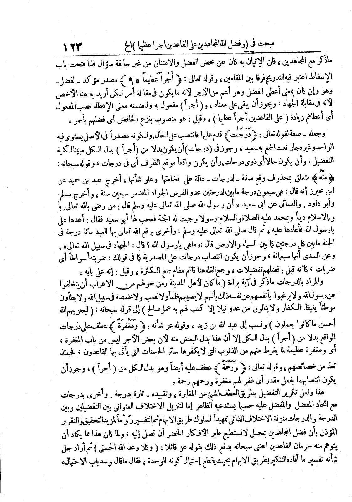 هذا ولعل تكرير التفضل بطريق العطف المنبىء عن المغايرة وتقييده تارة بدرجة وأخرى بدرجات مع اتحاد المفضل والمفضل عليه حسبما يستدعيه الظاهر إما لتنزيل الاختلاف العنوانى بين التفضيلين وبين الدرجة والدرجات منزلة الاختلاف الذاتى تمهيدا لسلوك طريق الابهام ثم التفسير وما لمزيد التحقيق والتقرير المؤذن بأن فضل المجاهدين بمحل لاتستطيع طير الأفكار الخضر ان تصل اليه ولما كان هذا ممالايكاد أن يتوهم منه حرمان القاعدين اعتنى سبحانه بدفع ذلك بقوله عز قائلا : وكلا وعد الله الحسنى ثم أراد جل شأنه تفسير ما أفاده التنكير بطريق الابهام بحيث يقطع إحتمال كونه للوحدة ن فقال ماقال وسد باب الاحتمال