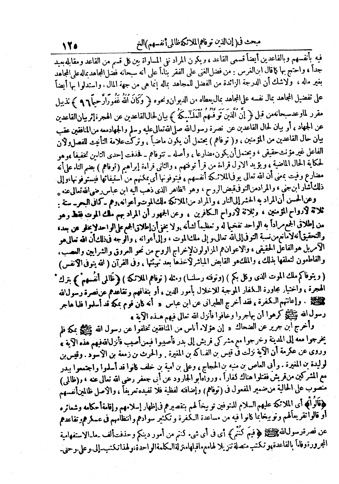 فيه بأنفسهم وبالقاعدين أيضا قسمى القاعد ويكون المراد نفى المساواة بين كل قسم من القاعد ومقابله بعيد جدا واحتج بها كماقال ابن الغرس : من فضل الغنى على الفقر بناءا على أنه سبحانه فضل المجاهد بماله على المجاهد بغير ماله ولاشك أن الدرجة الزائدة من الفضل للمجاهد بماله إنما هى من جهة المال واستدلوا بها أيضا على تفضيل المجاهد بمال نفسه على المجاهد بمال يعطاه من الديوان ونحوه وكان الله غفورا رحميا تذييل مقرر لما وعد سبحانه من قبل إن الذين توفاهم الملائكة بيان لحال القاعدين عن الهجرة إثر بيان القاعدين عن الجهاد أو بيان الحال القاعين عن نصرة رسول الله صلى الله عليه و سلم والجهاد معه من المنافقين عقب بيان حال القاعدين من المؤمنين و توفاهم يحتمل أن يكون ماضيا وتركت علامة التأنيث للفصل ولأن الفاعل غير الؤنث حقيقى ويحتمل أن يكون مضارعا وأصله تتوفاهم فحذفت إحدى التاءين تخفيفا وهو لحكاية الحال الماضية ويؤيد الاول قراءة من قراءة من قرأ توفتهم والثانى قراءة إبراهيم توفاهم بضم التاء على أنه مضارع وفيت بمعنى أن الله تعالى يوفى الملائكة أنفسهم فيتوفونها أى يمكنهم من استيفائها فيستوفنها وإلى ذلك أشار ابن جنى والمراد من التوفى قبض الروح وهو الظاهر الذي ذهب اليه ابن عباس رضى الله تعالى عنه