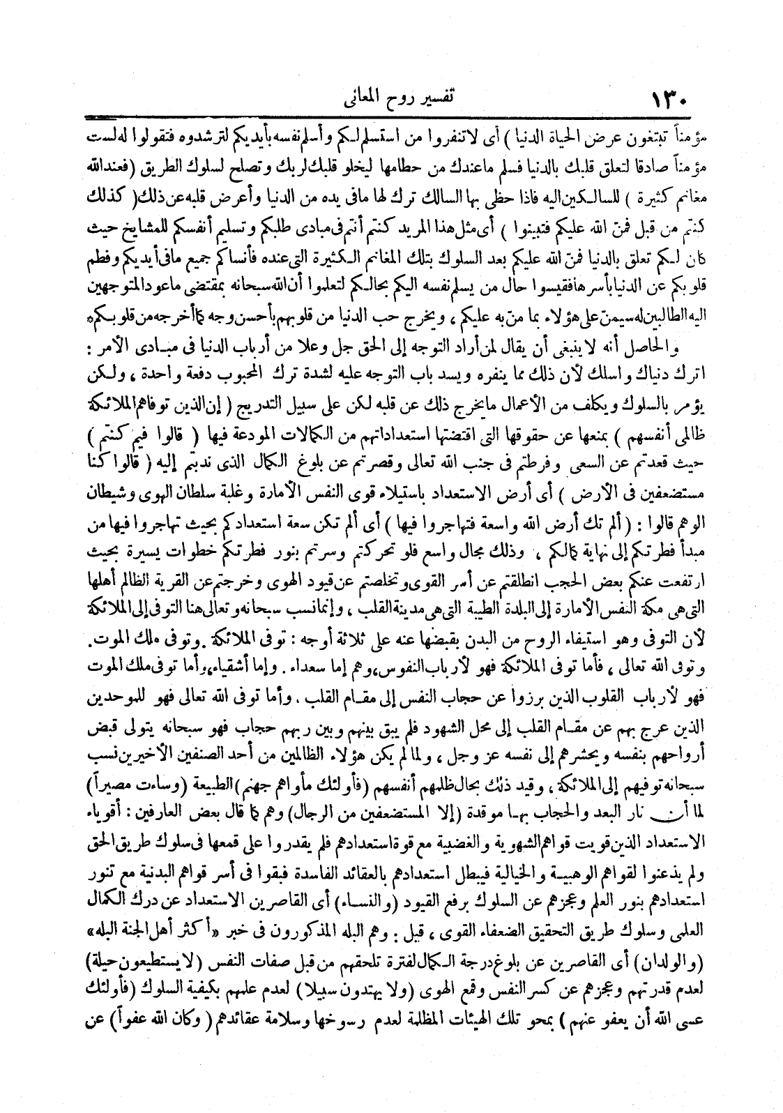 والحاصل أنه لاينبغى أن يقال لمن أراد التوجه إلى الحق جل وعلا من أرباب الدنيا فى مبادى الأمر : اترك دنياك واسلك لأن ذلك مما ينفره ويسد باب التوجه عليه لشدة ترك المحبوب دفعة واحدة ولكن يؤمر بالسلوك ويكلف من الأعمال مايخرج ذلك عن قلبه لكن على سبيل التدريج إن الذين توفاهم الملائكة ظالمى أنفسهم يمنعها عن حقوقها التى اقتضتها استعداداتهم من الكلمات المودعة فيها قالوا فيم كنتم حيث قعدتم عن السعى وفرطتم فى جنب الله تعالى وقصرتم عن بلوغ الكمال الذى ندبتم اليه قالوا مستضعفين فى الأرض أى أرض الاستعداد باستيلاء قوى النفس الأمارة وغلبة سلطان الهوى وشيطان الوهم : ألم تكن أرض الله واسعة فتهاجروا فيها أى لم تكن سعة استعدادكم بحيث تهاجروا فيها من مبدأ فطرتكم إلى نهاية كمالكم وذلك مجال واسع فلو تحركتم وسرتم بنور فطرتكم خطوات يسيرة بحيث ارتفعت عنكم بعض الحجب انطلقتم عن أسر القوى وتخلصتم عن قيود الهوى وخرجتم عن القرية الظالم أهلها التى هى مكة النفس الأمارة إلى البلدة الطيبة التى هى مدينة القلب وإنما نسب سبحانه وتعالى هنا التوفى إلى الملائكة لأن التوفى وهو استيفاء الروح من البدن بقبضها عنه على ثلاثة أوجه : توفى الملائكة وتوفى ملك الموت وتوفى الله تعالى فأما توفى الملائكة فهو لأرباب النفوس وهم اما سعداء وإما أشقياء وأما توفى ملك الموت فهو لأرباب القلوب الذين برزوا عن حجاب النفس إلى مقام القلب وأما توفى الله تعالى فهو للموحدين الذين عرج بهم عن مقام القلب إلى محل الشهود فلم يبق بينهم وبين ربهم حجاب فهو سبحانه يتولى قبض أرواحهم بنفسه ويحشرهم إلى نفسه عز و جل ولما لم يكن الظالمين من أحد الصنفين الأ خيرين نسب سبحانه توفيهم الى الملائكة وقيد ذلك بحال ظلمهم أنفسهم فأولئك مأواهم جهنم الطبيعة وساءت مصيرا لما أن نار البعد والحجاب بها موقدة إلا من المستضعفين من الرجال وهم كما قال بعض العارفين : أقوياء الاستعداد الذين قويت قواهم الشهوية والغضبية مع قوة استعدادهم فلم يقدروا على قمعها فى سلوك طريق الحق ولم يذعنوا لقواهم الوهبية والخيالية قيبطل استعدادهم بالعقائد الفاسدة فى أسر قواهم البدنية مع تنور استعدادهم بنور العلم وعجزهم عن السلوك برفع القيود والنساء أى القاصرين الاستعداد عن درك الكمال العلمى وسلوك طريق التحقيق الضعفاء القوى قيل : وهم البله المذكورون فى خبر أكثر أهل الجنة البله والولدان أى القاصرين عن بلوغ درجة الكمال لفترة تلحقهم من قبل صفات النفس لايستطعيون حيلة لعدم قدرتهم وعجزهم عن كسر النفس وقمع الهوى ولايهتدون سبيلا لعدم علمهم بكيفية السلوك فأولئك عسى الله أن يعفو عنهم بمحو تلك الهيئات المظلمة لعدم رسوخها وسلامة عقائدهم وكان الله عفوا عن
