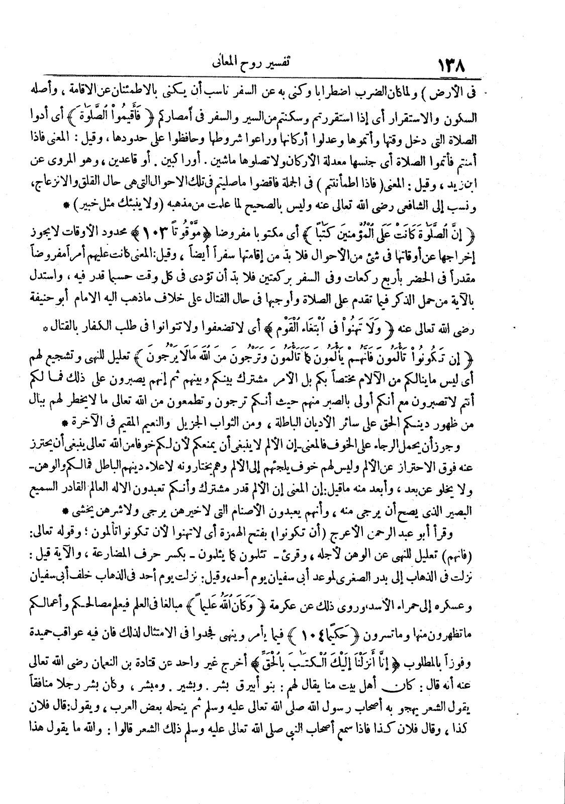 فى الأرض ولما كان الضرب اضطرابا وكنى به عن السفر ناسب أن يكنى بالاطمئنان عن الاقامة وأصله السكون والاستقرار اذا استقررتم من السير والسفر فى أمصاركم فأقيموا الصلاة أى أدوا الصلاة التى دخل وقتها وأتموها وعدلوا أركانها وراعو شروطها وحافظوا على حدودها وقيل : المعنى فاذا أنتم فأتموا الصلاة أى جنسها معدلة الأركان ولاتصلوها ماشين أو راكبين أو قاعيدن وهو المروى عن ابن زيد وقيل : المعنى فاذا اطمأننتم فى الجملة فاقضوا ماصليتم فى تلك الاحوال التى هى حال القلق والانزعاج ونسب الى الشافعى رضى الله تعالى عنه وليس بالصحيح لما علمت من مذهبه ولاينبئك مثل خبير