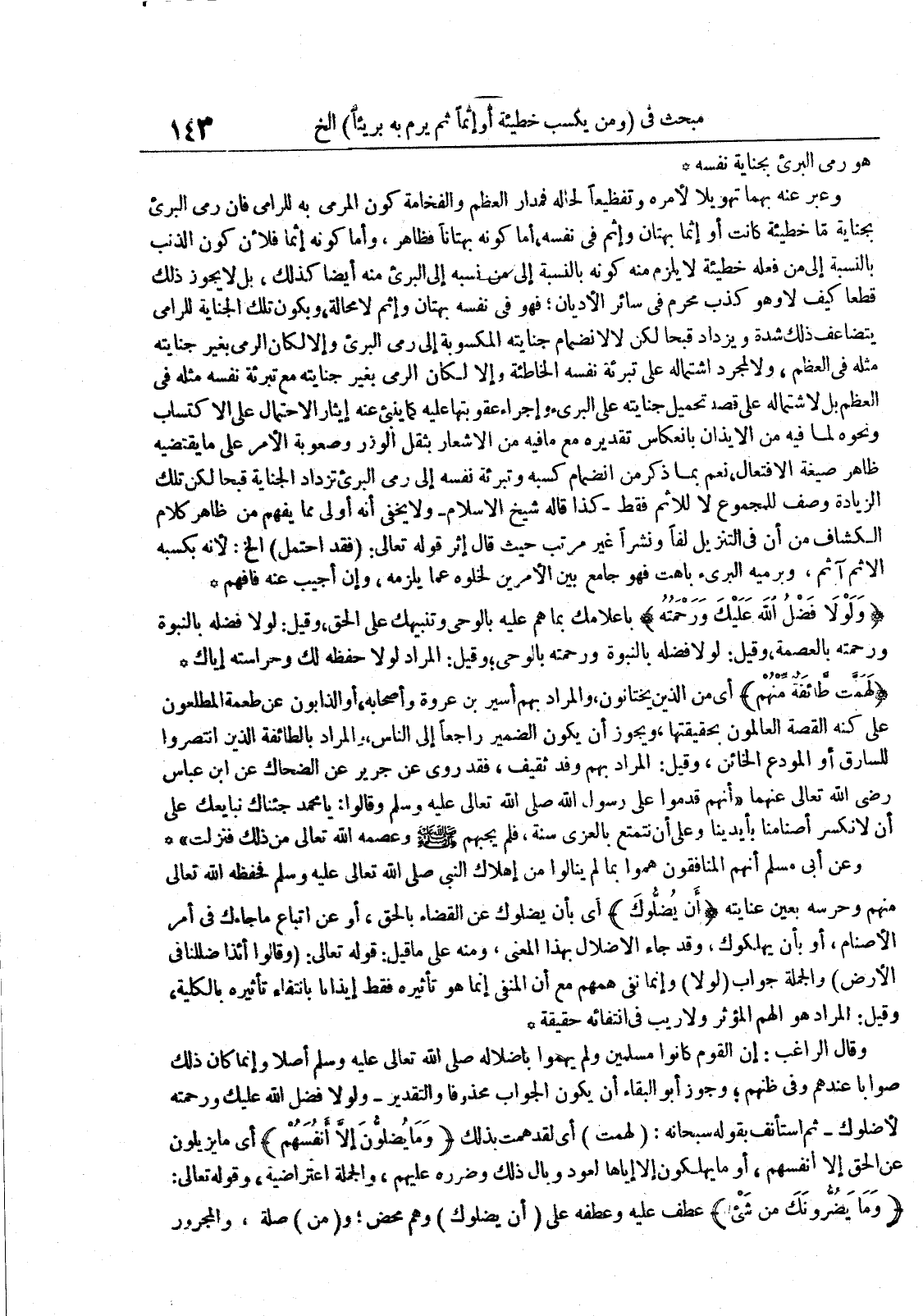 وقال الراغب : إن القوم كانوا مسلمين ولم يهموا باضلاله صلى الله تعالى عليه وسلم أصلا وإنما كان ذلك صوابا عندهم وفى ظنهم وجوز أبو البقاء أن يكون الجواب محذوفا والتقدير ولولا فضل الله عليك ورحمته لأضلوك ثم استأنف بقوله سبحانه : لهمت أى لقد همت بذلك وما يضلون إلا أنفسم أى مايزيلون عن الحق إلا أنفسهم أو مايهلكون إلا إياها لعود وبال ذلك وضرره عليهم والجملة اعتراضية وقوله تعالى : ومايضرونك من شىء عطف عليه وعطفه على أن يضلوك وهم محض و من صلة والمجرور