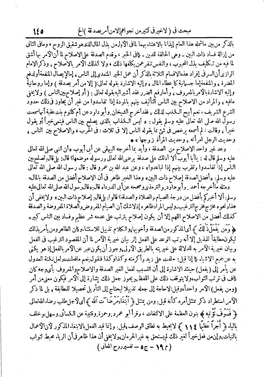 بالذكر من بين ماشمله هذا العام إيذانا بلاعتناء بهما لما فى الأول من بذل المال الذى هو شقيق الروح وما فى الثانى من إزالة فساد ذات البين وهى الحالقة للدين كما فى الخبر وقدم الصدقة على الاصلاح لما أن الأمر بها أشق لما فيه من تكليف بذل المحبوب والنفس تنفر عمن يكلفها ذلك ولا كذلك الأمر بالاصلاح وذكر الامام الرزاى أن السر فى إفراد هذه الاقسام الثلاثة بالذكر أن عمل الخير المتعدى إلى الناس إما لإيصال المنفعة أو لدفع المضرة والمنفعة اما جسمانية كإعطاء المال وإليه اشارة بقوله تعالى : إلا من أمر بدقة وإما روحانية وإليه الاشارة بالأمر بالمعروف وأما رفع الضر فقد أشير اليه بقوله تعالى : أو اصلاح بين الناس ولايخفى مافيه والمراد من الاصلاح بين الناس التأليف بينهم بالمودة إذا تفاسدوا من غير أن يجاوز فى ذلك حدود الشرع الشريف نعم أبيح الكذب لذلك فقد أخرج الشيخان وأبو داود عن أم كلثوم بنت عقبة أنها سمعت رسول الله صلى الله عليه و سلم يقول : ليس الكذاب الذى يصلح بين الناس فينمى خيرا أو يقول خيرا وقالت : لم أسمعه يرخص فى شىء مما يقوله الناس إلا فى ثلاث : فى الحرب والاصلاح بين الناس وحديث الرجل امرأته وحديث المرأة زوجها