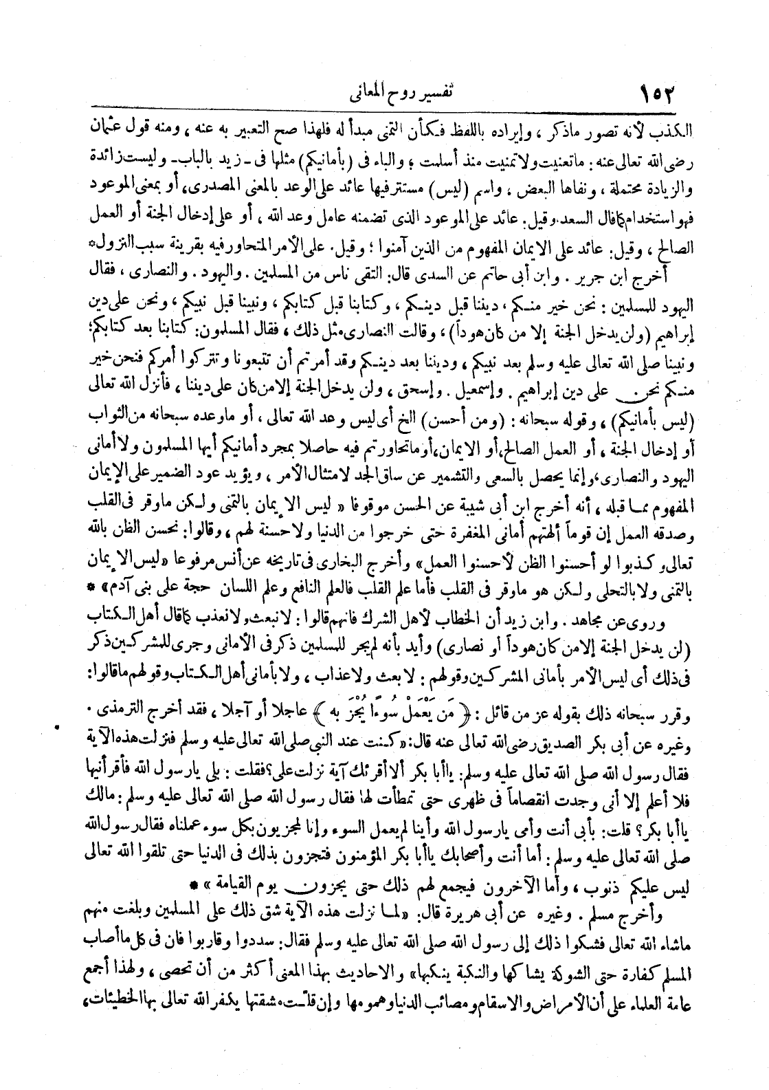 أخرج ابن جرير وابن أبى حاتم عن السدى قال : التقى ناس من المسلمين واليهود والنصارى فقال اليهود للمسلمين : نحن خير منكم ديننا قبل دينكم وكتابنا قبل كتابكم ونبينا قبل نبيكم ونحن على دين ابراهيمم ولن يدخل الجنة الا من كان هودا وقالت النصارى مثل ذلك فقال المسلمون : كتابنا بعد كتابكم ونبينا صلى الله عليه و سلم بعد نبيكم وديننا بعد دينكم وقد أمرتم أن تتبعونا وتتركوا أمركم فنحن خير منكم نحن على دين ابراهيم وإسماعيل وإسحق ولن يدخل الجنة إلا من كان على ديننا فأنزل الله تعالى ليس بأمانيكم وقوله سبحانه : ومن أحسن الخ أى ليس وعد الله تعالى أو ماوعد سبحانه من الثواب أو إدخال الجنة أو العمل الصالح أو الايمان أو ادخال الجنة أو العمل الصالح أو الايمان أو ماتحاورتم تم فيه حاصلا بمجرد أمانيكم أيها المسلمون ولاأمانى اليهود والنصارى وإنما يحصبل بالسعى والتشمير عن ساق الجد لامتثال الأمر ويؤيد عود الضمير على الإيمان المفهوم مما قبله أنه أحرج ابن أبى شيبة عن الحسن موقوفا ليس الإيمان بالتمنى ولكن ماوقر فى القلب وصدقه العمل إن قوما ألهتهم أمانى المغفرة حتى خرجوا من الدنيا ولاحسنة لهم وقالوا : نحسن الظن بالله تعالى وكذبوا لو أحسنوا الظن لأحسنوا العمل وأحرج البخارى فى تاريخه عن أنس مرفوعا ليس الإيمان بالتمنى ولا بالتحلى ولكن هو ماوقر فى القلب فأما علم القلب فالعلم النافع وعلم اللسان حجة على بنى آدم