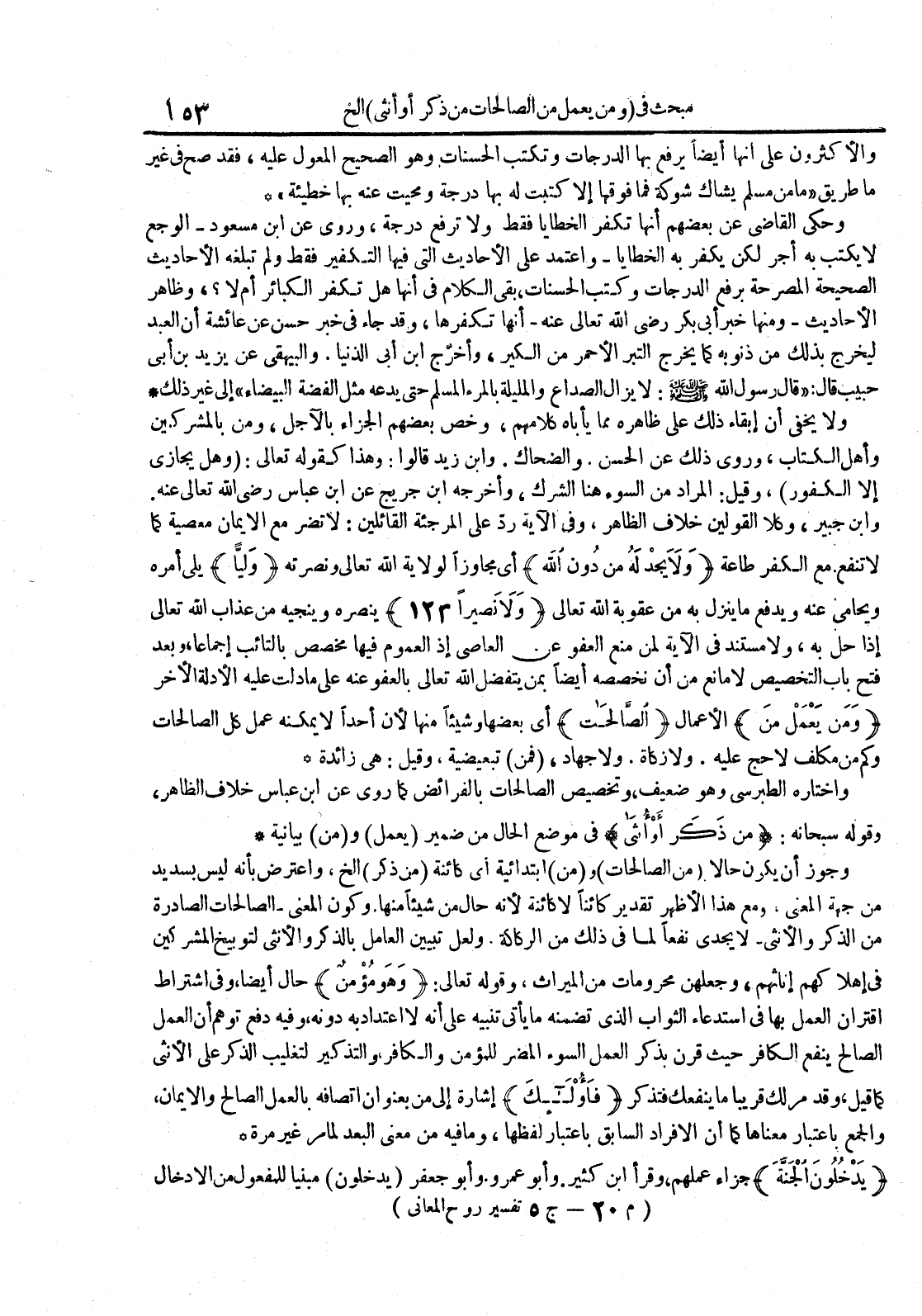 واختاره الطبرسى وهو ضعيف ونخصيص الصالحات بالفرائض كما روى عن ابن عباس خلاف الظاهر وقوله سبحانه من ذكر وأنثى فى موضع الحال من ضمير يعمل و من بيانية