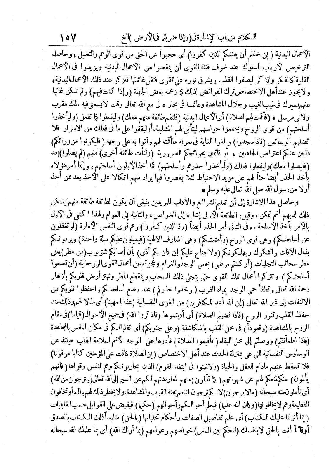 الأعمال البدنية إن خفتم أن يفتنكم الذين كفروا أى حجبوا عن الحق من قوى الوهم والتخيل وحاصله الترخيص لأرباب السلوك عند خوف فتنة القوى أن ينقصوا من الأعمال البدنية ويزيدوا فى الأعمال القلبية كالفكر والذكر ليصفوا القلب ويشرق نوره على القوى فتقل غائلتها فتزكو عند ذلك الأعمال البدنية ولايجوز عند أهل الاختصاص ترك الفرائض لذلك كما زعمه بعض الجهلة وإذا كنتم فيه ولم تكن غائبا عنهم بسيرك فى غيب الغيب وجلال المشاهدة وعائما فى بحار لى مع الله تعالى لايسعنى فيه ملك مقرب ولانبى مرسل فأقمت لهم الصلاة أى الأعمال البدنية فلتقم طائفة منهم معك وليفعلوا كما تفعل وليأخذوا أسلحتهم من قوى الروح ويجمعوا حواسهم ليتأتى لهم المشابهة أو ليقفوا على ما فى فعلك من الاسرار فلا تضلهم الوسائس فاذا سجدوا وبلغوا الغاية فى معرفه ماأقمته لهم وأتوا به على وجهه فليكونوا من ورائكم ذا بين عنكم اعتراض الجاهلين أو قائمين بحوائجكم الضرورية ولتأت طائفة أخرى منهم لم يصلوا بعد فليصلوا معك وليفعلوا فعلك وليأخذوا حذرهم وأسلحتهم كما أخذ الأولون أسلحتهم وإنما أمر هؤلاء بأخذ الحذر أيضا حثا على مزيد الاحتياط لئلا يقصروا فيها يراد منهم اتكالا على الأخذ بعد ممن أخذ أولا من رسول الله صلى الله عليه و سلم