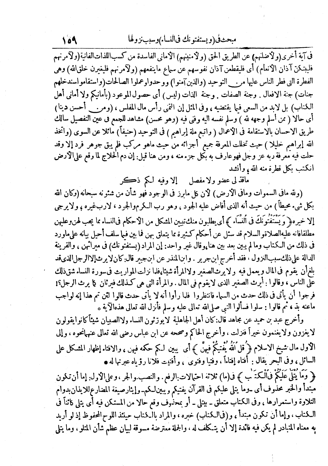 فى آية أخرى ولأضلنهم عن الطريق الاحق ولأمنيهم الأمانى الفاسدة من كسب اللذات الفانية ولآمرنهم فليبتكن آذان الأنعام أى فليقطعن آذان نفوسهم عن سماع ماينفعهم ولآمرنهم فليغيرن خلق الله وهى الفطرة التى فطر الناس عليها من التوحيد والذين آمنوا ووحدوا وعملوا الصالحات واستقاموا سندخلهم جنات جنة الافعال وجنة الصفات وجنة الذات ليس أى حصول الموعود بأمانيكم ولا أمانى أهل الكتاب بل لابد من السعى فيما يقتضيه وفى المثل إن التمنى راس مال المفلس ومن أحسن دينا أى حالا ممن أسلم وجهه لله وسلم نفسه اليه وفنى فيه وهو محسن مشاهد للجميع فى عين التفضيل سالك طريق الاحسان بالاستقامة فى الأعمال واتبع ملة ابراهيم فى التوحيد حنيفا مائلا عن السوى واتخذ الله إبراهيم خليلا حيث تخللت المعرفة جميع أجزائه من حيث ماهو مركب فلم يبق جوهر فرد إلا وقد حلت فيه معرفة ربه عز و جل فهو عارف به بكل جزء منه ومن هنا قيل : إن دم الحلاج لما وقع على الأرض انكتب بكل قطرة منه الله وأنشد ماقد لى عضو ولامفصل إلا وفيه لكم ذكر ولله مافى السموات ومافى الأرض لأن كل مابرز فى الوجود فهو شأن من شئونه سبحانه وكان الله بكل شىء محيطا من حيث أنه الذي أفاض عليه الجود وهو رب الكرم والجود لارب غيره ولايرجى إلا خيره ويستفتونك فى النساء أى يطلبون منك تبيين المشكل من الأحكام فى النساء مما يجب لهن وعليهن مطلقا فانه عليه الصلاة و السلام قد سئل عن أحكام كثيرة مما يتعلق بهن فما بين فيما سلف أحيل بيانه على ماورد فى ذلك من الكتاب ومالم يبين بعد بين هنا وقال غير واحد : إن المراد يستفتونك فى ميراثهن والقرينة الدالة على ذلك سبب النزول فقد أخرج ابن جرير وابن المنذر عن ابن جبير قال : كان لايرث إلا الرجل الذي قد بلغ أن يقوم فى المال ويعمل فيه ولايرث الصغير ولا المرأة شيئا فلما نزلت المواريث فى سورة النساء شق ذلك على الناس وقالوا أيرث الصغير الذى لايقوم فى المال والمرأة التى هى كذلك فيرثان كما يرث الرجل ! فرجوا أن يأتى فى ذلك حدث من السماء فانتظروا فلما رأوا أنه لايأتى حدث قالوا لئن تم هذا أنه لايأتى حدث قالوا لئن تم هذا إنه لواجب ماعنه بد ثم قالوا : سلوا النبى صلى الله عليه و سلم فأنزل الله تعالى هذه الآية