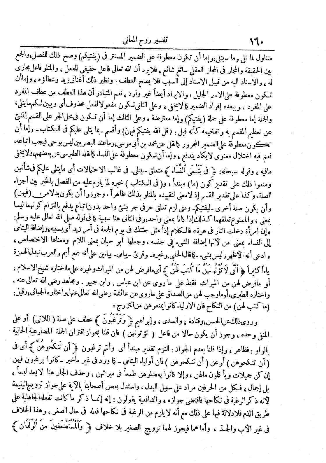 متناول لما تالى وما سيتلى وإما أن تكلون معطوفة على الضمير المستتر فى يفتيكم وصح ذلك للفصل والجمع بين الحقيقة والمجار فى المجاز العقلى سائغ شائع فلايرد أن الله تعالى فاعل حقيقى للفعل والمتلو فاعل مجازى له والاسناد الى السبب فلا يصح العطف ونظير ذلك أغنانى زيد وعطاؤه وإما لأن تكون معطوفة على الاسم الجليل والايراد أيضا غير وارد نعم المتبادر أن هذا العطف من عطف المفرد على المفرد ويبعده إفراد الضمير كما لايخفى وعلى الثانى تكون مفعولا لفعل محذوف أى ويبين لكم مايتلى والجملة إما معطوفة على جملة يفتيكم وإما معترضة وعلى الثالث إما أن تكون فى محل الجر على القسم المنبىء عن تعظيم المقسم به وتفخيمه كأنه قيل : قل الله يفتيكم فيهن وأقسم بما يتلى عليكم فى الكتاب وإما أن تكون معطوفة على الضمير المجرور كما نقل عن محمد بن أبى موسى وما عند البصريين ليس بوحى فيجب اتباعه نعم فيه اختلال معنوى لايكاد يندفع وإما أن تكون معطوفة على النساء كما نقله الطبرسى عن بعضهم ولايخفى مافيه وقوله سبحانه : فى يتامى النساء متعلق بيتلى فى غالب الاحتمالات أى مايتلى عليكم فى شأنهن ومنعوا ذلك على تقدير كون ما مبتدأ و فى الكتاب خبره لما يلزم عليه من الفصل بالخبر بين أجزاء الصلة وكذا على تقدير القسم إذ لامعنى لتقييده بالمتلوا بذلك ظاهرا أن يكون بدلا من فيهن وأن يكون صلة أخرى ليفتيكم ومتى لزم تعلق حرفى جر بشىء واحد بدون اتباع يدفع بالتزام كونهما ليسا بمعنى والممنوع تعلقهما كذلك إذا كانا بمعنى واحد وفى الثانى هنا سببية كما فى قوله صلى الله تعالى عليه وسلم : إن امرأة دخلت النار فى هرة فالكلام إذا مثل جئتك فى يوم الجمعة فى أمر زيد أى بسببه وإضافة اليتامى إلى النساء بمعنى من لأنها إلى جنسه وجعلها ابو حيان بمعنى اللام ومعناها الاختصاص وادعى أنه الأظهر وليس بشىء كما قال الحلبى وغيره وقرىء بيامى بياءين على أنه جمع أيم والعرب تبدل الهمزة ياءا كثيرا التى لاتؤتونهن ماكتب لهن أى مافرض لهن من الميراث وغيره على مااختاره شيخ الاسلام أو مافرض لهن من الميراث فقط على ماروى عن ابن عباس وابن جبير ومجاهد رضى الله عنه واختاره الطبرى أو ماوجب لهن من الصداق على ماروى عن عائشة رضى الله تعالى عنها واختاره الجبائى وقيل : ماكتب لهن من النكاح فان الاولياء كانوا يمنعوهن من التزوج