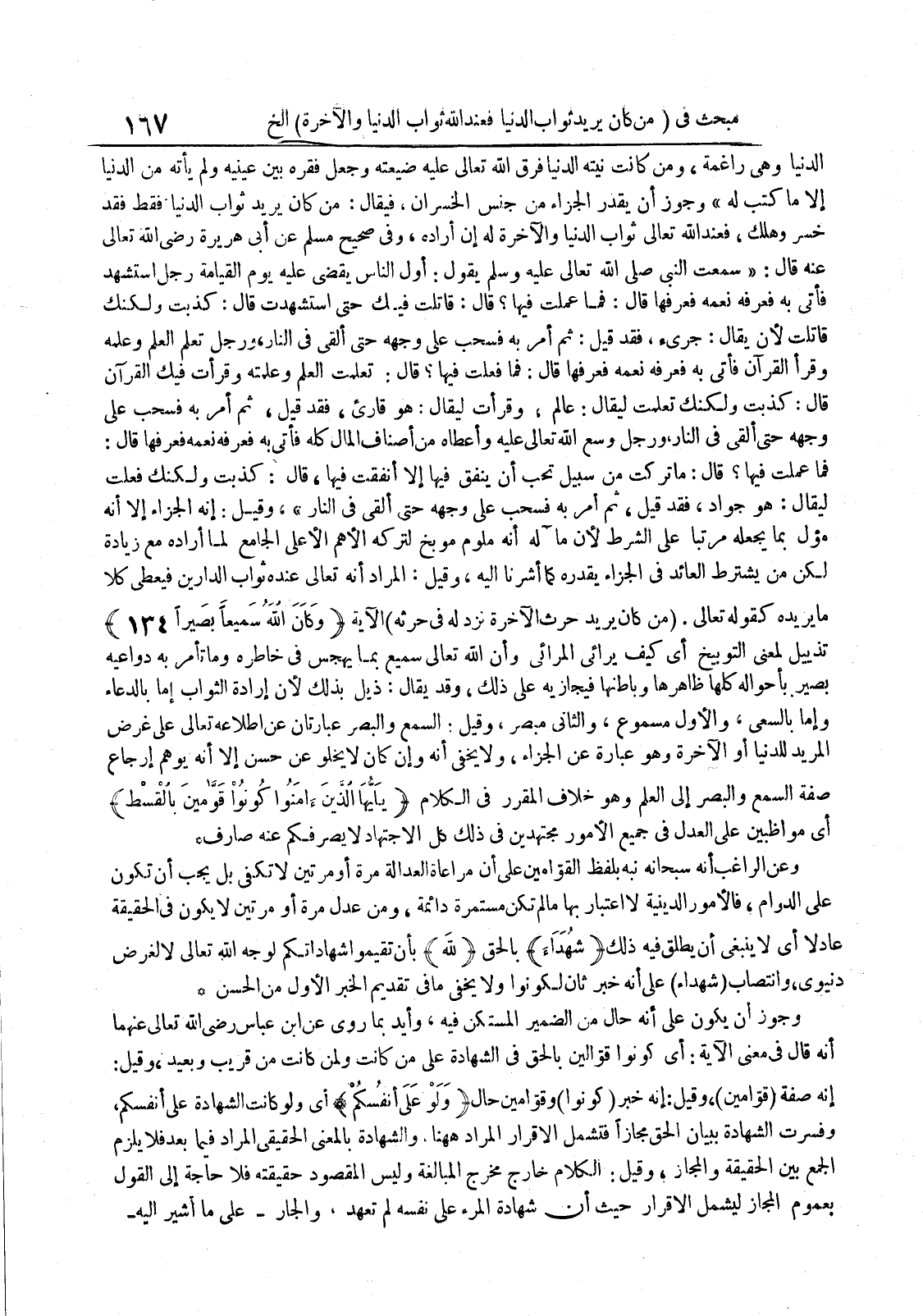 الدنيا وهى راغمة ومن كانت نيته الدنيا فرق الله تعالى عليه ضيعته وجعل فقره بين عينيه ولم يأته من الدنيا إلا ماكتب له وجوز أن يقدر الجزاء من جنس الخسران فيقال : من كان يريد ثواب الدنيا فقط فقد حسر وهلك فعند الله تعالى ثواب الدنيا والآخرة له إن أراده وفى صحيح مسلم عن أبى هريرة رضى الله تعالى عنه قال : سمعت النبى صلى الله عليه و سلم يقول : أول اناس يقضى عليه يوم القيامة رجل استشهد فاتى به فعرفه نعمه فعرفها قال : فما عملت فيها قال : قاتلت فيك حتى استشهدت قال : كذبت ولكنك قاتلت لأن يقال : جرىء فقد قيل : ثم أمر به فسحب على وجهه حتى ألقى فى النار ورجل تعلم العلم وعلمه وقرأ القرآن فأتى به فعرفه نعمه فعرفها قال : فما عملت فيها قال : تعلمت العلم وعلمته وقرأت فيك القرآن قال : كذبت ولكنك تعلمت ليقال : عالم وقرأت ليقال : هو قارىء فقد قيل ثم أمر به فسحب على وجهه حتى ألقى فى النار ورجل وسع الله تعالى عليه وأعطاه من أصناف المال كله فأتى به فعرفه نعمه فعرفها قال : فما عملت فيها قال : ماتركت من سبيل تحب أن ينفق فيها إلا أنفقت فيها قال : كذبت ولكنك فعلت ليقال : هو جواد فقد قيل ثم أمر به فسحب على وجهه حتى ألقى فى النار وقيل : إنه الجزاء إلا أنه مؤل بما يجعله مرتبا على الشرط لأن مآ له أنه ملوم موبخ لتركه الأهم الأعلى الجامع لما أراده مع زيادة لكن من يشترط العائد فى الجزاء يقدره كما أشرنا اليه وقيل : المراد أنه تعالى عنده ثواب الدارين فيعطى كلا مايريده كقوله تعالى من كان يريد حرث الآخرة نزد له فى حرثه الآية وكان الله سميعا بصيرا