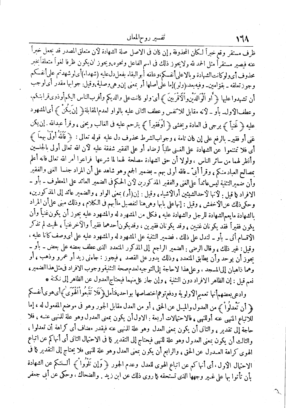 وادعى بعضهم أنها تعميم الأولوية ودفع توهم اختصاصها بواحد فتأمل فلا تتبعوا الهوى أى هوى أنفسكم أن تعدلوا من العدول والميل عن الحق أو من العدل مقابل الجور وهو فى موضع المفعول له إما للاتباع المنهى عنه أو للنهى فالاحتمالات أربعة : الاول أن يكون بمعنى العدول وهو علة للمنهى عنه فلا حاجة إلى تقدير والثانى أن يكون بمعنى العدل وهو علة للمنهى عنه فيقدر مضاف أى كراهة أن تعدلوا والثالث أن يكون بمعنى العدول وهو علة للنهى فيحتاج إلى التقدير كما فى الاحتمال الثانى أى أنها كم عن اتباع الهوى كراهة العدول عن الحق والرابع أن يكون بمعنى العدل وهو علة للنهى فلا يحتاج إلى التقدير كما فى الاحتمال الأول أى أنهاكم عن اتباع الهوى للعدول وعدم الجور وان تلووا ألسنتكم عن الشهادة بأن تأتوا بها على غير وجهها الذي تستحقه كما روى ذلك عن ابن زيد والضحاك وحكى عن أبى جعفر