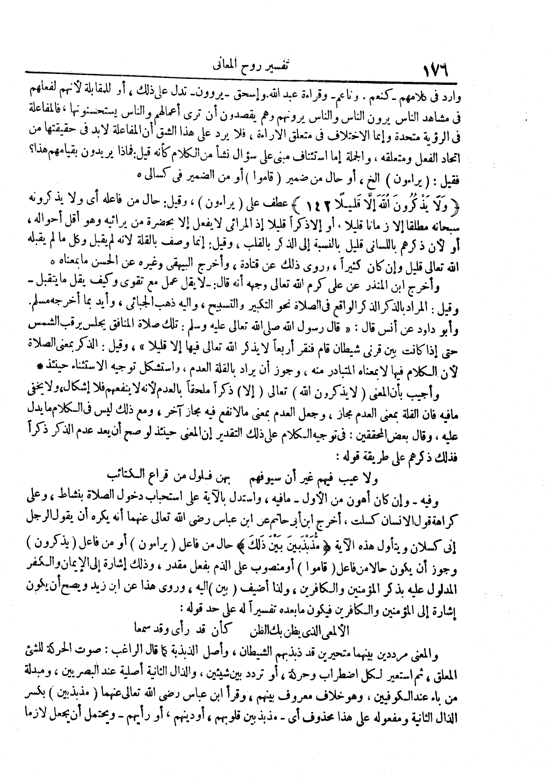 وأخرج ابن المنذر عن على كرم الله وجهه أنه قال : لايقل عمل مع تقوى وكيف يقل مايتقبل وقيل : المراد بالذكر الذكر الواقع فى الصلاة نخو التكبير والتسبيح واليه ذهب الجبائى وأيد بما أخرجه مسلم وأبو داود عن أنس قال : قال رسول الله صلى الله عليه و سلم : تلك صلاة المنافق يجلس يرقب الشمس حتى إذا كانت بين قرنى شيطان قام فنقر أربعا لايذكر الله تعالى فيها إلا قليلا وقيل : الذكر بمعنى الصلاة لأن الكلام فيها لابمعناه المتبادر منه وجوز أن يراد بالقلة العدم واستشكل توجيه الاستثناء حينئذ