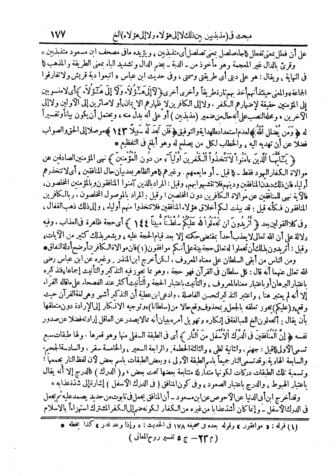 ومن الناس من أبقى السلطان على معناه المعروف لكن أخرج ابن المنذر وغيره عن ابن عباس رضى الله تعالى عنهما أنه قال : كل سلطان فى القرآن فهو حجة وهو مما يجوز فيه التذكير والتأنيث إجماعا فتذكيره باعتبار البرهان أو بأعتبار معناه المعروف والتأنيث باعتبار الحجة أكثر عند الفصحاء على ماقاله الفراء إلا أنه لم يعتبرها هنا واعتبر التذكير لتحسن الفاصلة وادعى ابن عطية أن التذكير أشهر وهى لغة القرآن حيث وقع و عليكم يجوز تعلقه بالجعل وبمحذوف وقع حالا من سلطانا وتوجيه الانكار الى الإرادة دون متعلقها بأن يقال : أتجعلون الخ للمبالغة فى إنكاره وتهويل أمره ببيان أنه ممالايصدر عن العاقل إرادته فضلا عن صدور نفسه إن المنافقين فى الدرك الأسفل من النار أى فى الطبقة السفلى منها وهو قعرها ولها طبقات سبع تسمى الأولى كما قيل : جهنم والثانية لظى والثالثة الحطمة والرابعة السعير والخامسة سقر والسادسة الجحيم والسابعة الهاوية وقد تسمى النار جميعا باسم الطبقة الأولى وبعض الطبقات باسم بعض لأن لفظ النار بجمعها وتسمية تلك الطبقات دركات لكونها متداركة متتابعة بعضها تحت بعض و الدرك كالدرج إلا أنه يقال باعتبار الهبوط والدرج باعتبار الصعود وفى كون المنافق فى الدرك الأسفل إشارة الى شدة عذابه