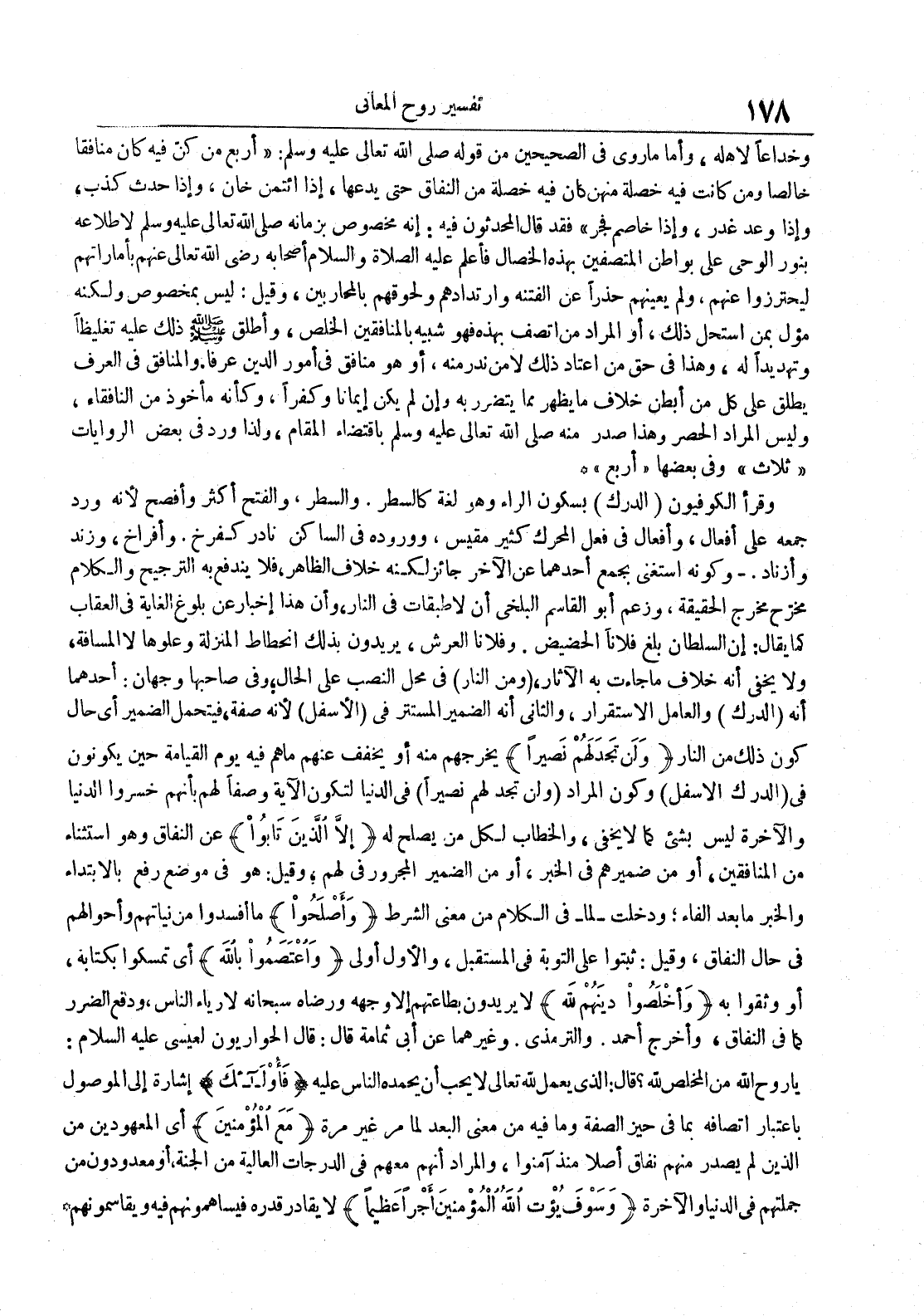 وقرأ الكوفيون الدرك بسكون الراء وهو لغة كالسطر والسطر والفتح أكثر وأفصح لأنه ورد جمعه على أفعال وأفعال فى فعل المحرك كثير مقيس ووروده فى الساكن نادر كفرخ وأفراخ وزند وأزناد وكونه استغنى بجمع أحدهما عن الآخر جائز لكنه خلاف الظاهر فلا يندفع به الترجيح والكلام مخرج مخرج الحقيقة وزعم أبو القاسم البلخى أن لاطبقات فى النار وأن هذا إخبار عن بلوغ الغاية فى العقاب كما يقال : إن السلطان بلغ فلانا الحضيض وفلانا العرش يريدون بذلك انحطاط المنزلة وعلوها لا المسافة ولايخفى أنه خلاف ماجاءت به الآثار ومن النار فى محل نصب على الحال وفى صاحبها وجهان : أحدهما أنه الدرك والعامل الاستقرار والثانى أنه الضمير المستتر فى الأسفل لأنه صفة فيحتمل الضمير أى حال كون ذلك من النار ولن تجد لهم نصيرا يخرجهم منه أو يخفف عنهم ماهم فيه يوم القيامة حين يكونون فى الدرك الاسفل وكون المراد ولن تجد لهم نصيرا فى الدنيا لتكون الآية وصفا لهم بأنهم خسروا الدنيا والآخرة ليس بشىء كما لايخفى والخطاب لكل كمن يصلح له إلا الذين تابوا عن النفاق وهو استثناء من المنافقين أو من ضميرهم فى الخبر أو من الضمير المجرور فى لهم وقيل : هو فى موضع رفع بالابتداء والخبر مابعد الفاء ودخلت لما فى الكلام من معنى الشرط وأصلحوا ماأفسدوا من نياتهم وأحوالهم فى حال النفاق وقيل : ثبتوا على التوبة فى المستقبل والأول أولى واعتصموا بالله أى تمسكوا بكتابه أو ثقوا به وأخلصوا دينهم لله لايريدون بطاعتهم إلا وجهه ورضاه سبحانه لارياء الناس ودفع الضرر كما فى النفاق وأخرج أحمد والترمذى وغيرهما عن أبى ثمامة قال : قال الحواريون لعيسى عليه السلام : ياروح الله من المخلص لله قال : الذي يعمل لله تعالى لايحب أن يحمده الناس عليه فأولئك اشارة إلى الموصول باعتبار اتصافه بما فى حيز الصفة ومافيه من معنى البعد لما مر غير مرة مع المؤمنين أى المعهودين من الذين لم يصدر منهم نفاق أصلا منذ أن آمنوا والمراد أنهم معهم فى الدرجات العالية من الجنة أو معدودون من جملتهم فى الدنيا والآخرة وسوف يؤت الله المؤمنين أجرا عظيما لا يقادر قدره فيساهمونهم فيه ويقاسمونهم