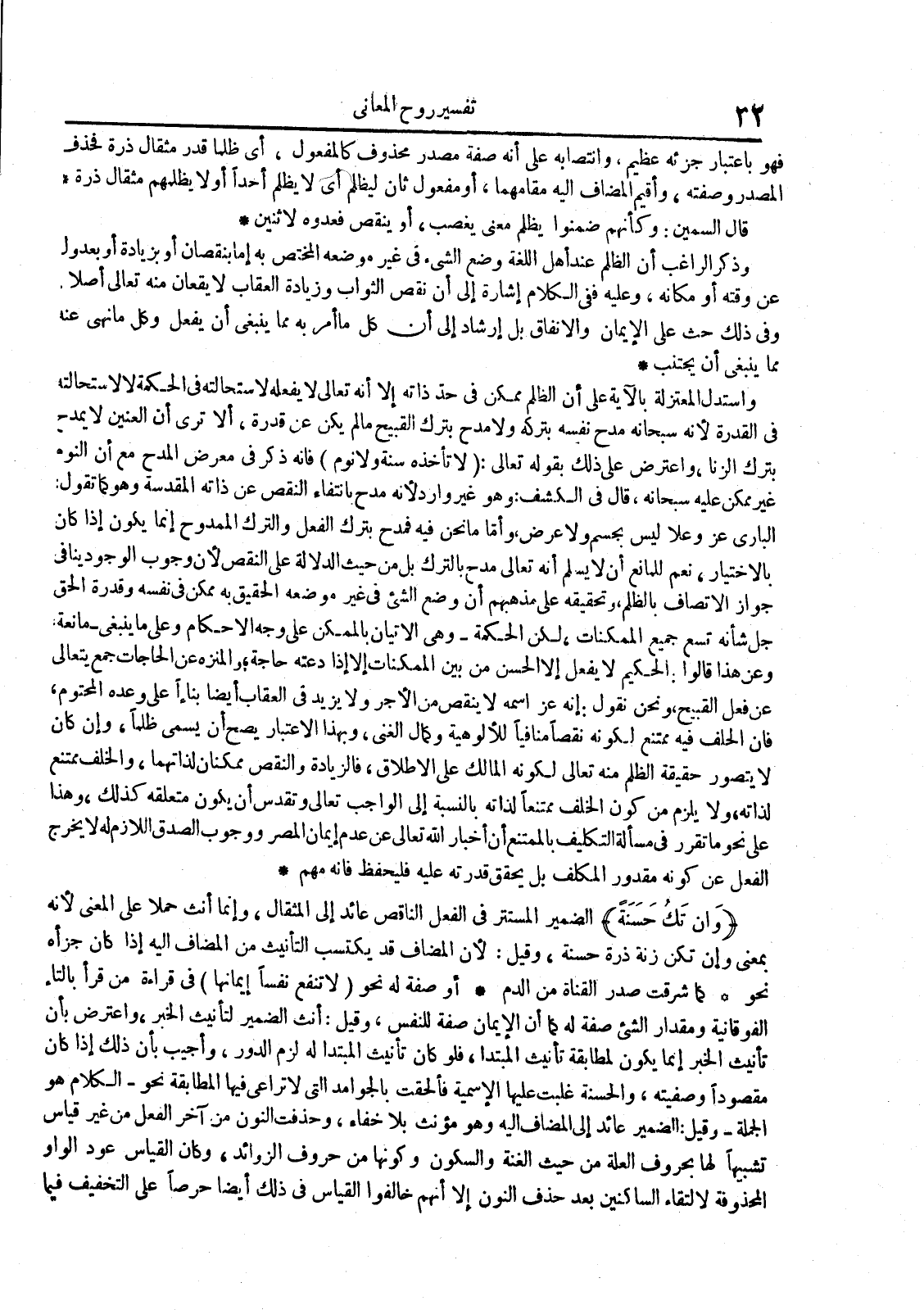 أو صفة له نحو لا تنفع نفسا إيمانها في قراءة من قرأ بالتاء الفوقانية ومقدار الشئ صفة له كما أن الإيمان صفة للنفس وقيل : أنث الضمير لتأنيث الخبر واعترض بأن تأنيث الخبر إنما يكون لمطابقة تأنيث المبتدأ فلو كان تأنيث المبتدأ له لزم الدور وأجيب بأن ذلك إذا كان مقصودا وصفيته والحسنة غلبت عليها الاسمية فألحقت بالجوامد التي لا تراعى فيها المطابقة نحو الكلام هو الجملة وقيل : الضمير عائد إلى المضاف إليه وهو مؤنث بلا خفاء وحذفت النون من آخر الفعل من غير قياس تشبيها لها بحروف العلة من حيث الغنة والسكون وكونها من حروف الزوائد وكان القياس عود الواو المحذوفة لالتقاء الساكنين بعد حذف النون إلا أنهم خالفوا القياس في ذلك أيضا حرصا على التخفيف فيما