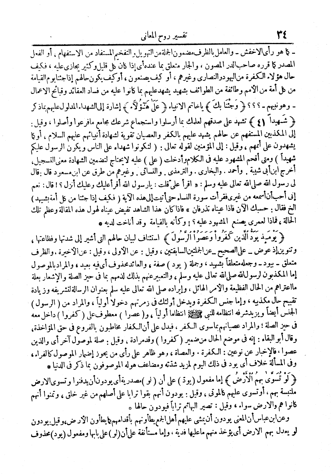 - تشهد على صدقهم لعلمك بما أرسلوا واستجماع شرعك مجامع ما فرعوا وأصلوا وقيل : إلى المكذبين المستفهم عن حالهم يشهد عليهم بالكفر والعصيان تقوية لشهادة أنبيائهم عليهم السلام أو كما يشهدون على أممهم وقيل : إلى المؤمنين لقوله تعالى : لتكونوا شهداء على الناس ويكون الرسول عليكم شهيدا وتى اقحم المشهود عليه في الكلام وأدخلت على عليه لا يحتاج لتضمين الشهادة معنى التسجيل أخرج ابن أبي شيبة وأحمد والبخاري والترمذي والنسائي وغيرهم من طرق عن ابن مسعود قال : قال لي رسول الله صلى الله تعالى عليه وسلم : إقرأ علي قلت : يا رسول الله أقرأ عليك وعليك أنزل قال : نعم إني أحب أن أسمعه من غيري فقرأت سورة النساء حتى أتيت إلى هذه الآية فكيف إذا جئنا من كل أمة بشهيد إلخ فقال : حسبك الآن فإذا عيناه تذرفان فإذا كان هذا الشاهد تفيض عيناه لهول هذه المقالة وعظم تلك الحالة فماذا لعمري يصنع المشهود عليه ! وكأنه بالقيامة وقد أناخت لديه