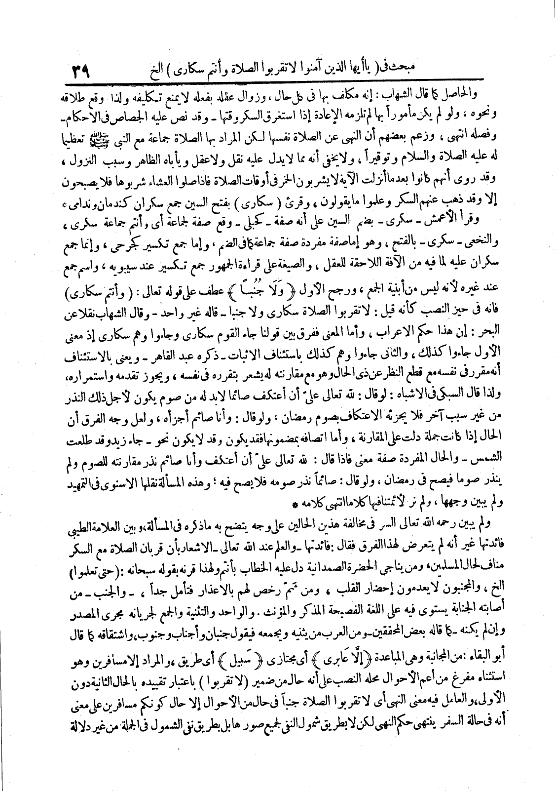 ولم يبين رحمه الله تعالى السر في مخالفة هذين الحالين على وجه يتضح به ما ذكره في المسألة وبين العلامة الطيبي فائدتها غير أنه لم يتعرض لهذا الفرق فقال : فائدتها والعلم عند الله تعالى الإشعار بأن قربان الصلاة مع السكر مناف لحال المسلمين ومن يناجي الحضرة الصمدانية دل عليه الخطاب بأنتم ولهذا قرنه بقوله سبحانه : حتى تعلموا إلخ والمجنبون لا يعدمون إحضار القلب ومن ثم رخص لهم بالإعذار فتأمل جدا والجنب من أصابته الجنابة يستوي فيه على اللغة الفصيحة المذكر والمؤنث والواحد والتثنية والجمع لجريانه مجرى المصدر وإن لم يكنه كما قاله بعض المحققين ومن العرب من يثنيه ويجمعه فيقول جنبان وأجناب وجنوب واشتقاقه كما قال أبو البقاء : من المجانبة وهي المباعدة إلا عابري أي مجتازي سبيل أي طريق والمراد إلا مسافرين وهو استثناء مفرغ من أعم الأحوال محله النصب على أنه حال من ضمير لا تقربوا باعتبار تقييده بالحال الثانية دون الأولى والعامل فيه معنى النهي أي لا تقربوا الصلاة جنبا في حال من الأحوال إلا حال كونكم مسافرين على معنى أنه في حالة السفر ينتهي حكم النهي لكن لا بطريق شمول النفي لجميع صورها بل بطريق نفي الشمول في الجملة من غير دلالة
