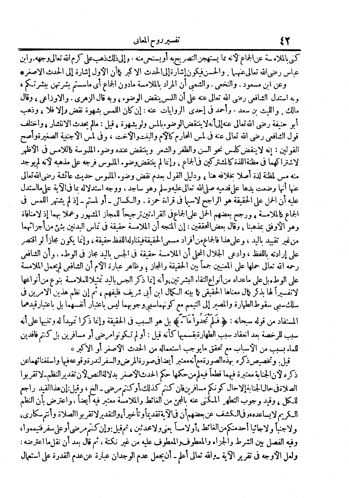 وعن ابن مسعود والنخعي والشعبي أن المراد بالملامسة ما دون الجماع أي ما سستم بشرتهن ببشرتكم وبه استدل الشافعي رضي الله تعالى عنه على أن اللمس ينقض الوضوء وبه قال الزهري والأوزاعي وقال مالك والليث بن سعد وأحمد في إحدى الروايات عنه : إن كان اللمس بشهوة نقض وإلا فلا وذهب أبو حنيفة رضي الله تعالى عنه إلى أنه لا ينتقض الوضوء بالمس ولو بشهوة قيل : ما لم يحدث الإنتشار واختلف قول الشافعي رضي الله تعالى عنه في لمس المحارم كالأم والبنت والأخت وفي لمس الأجنبية الصغيرة وأصح القولين : إنه لا ينقض كلمس نحو السن والظفر والشعر وينتقض عنده وضوء الملموسة كاللامس في الأظهر لاشتراكهما في مظنة اللذة كالمشتركين في الجماع وإنما لم ينتقض وضوء الملموس فرجه على مذهبه لأنه لم يوجد منه مس لمظنة لذة أصلا بخلافه هنا ودليل القول بعدم نقض وضوء الملموس حديث عائشة رضي الله تعالى عنها أنها وضعت يدها على قدميه صلى الله تعالى عليه وسلم وهو ساجد ووجه استدلاله بما في الآية على ما استدل عليه أن الحمل على الحقيقة هو الراجح لا سيما في قراءة حمزة والكسائي أو لمستم إذ لم يشتهر اللمس في الجماع كالملامسة ورجح بعضهم الحمل على الجماع في القراءتين ترجيحا للمجاز والمشهور وعملا بهما إذ لا منافاة وهو الأوفق بمذهبنا وقال بعض المحققين : إن المتجه أن الملامسة حقيقة في تماس البدنين بشئ من أجزائهما من غير تقييد باليد وعلى هذا فالجماع من أفراد مسمى الحقيقة فيتناوله اللفظ حقيقة وإنما يكون مجازا لو اقتصر على إرادته باللفظ وادعى الجلال المحلى أن الملامسة حقيقة في الجس باليد تمثيلا للملامسة بنوع من أنواعها لا تفسيرا لها بذكر كمال معناها الحقيقي كما بينه الكمال ابن أبي شريف فليفهم ثم إن نظم هذين الأمرين في سلك سببي سقوط الطهارة والمصير إلى التيمم مع كونهما سببي وجوبهما ليس باعتبار أنفسهما بل باعتبار قيدهما المستفاد من قوله سبحانه : فلم تجدوا ماء بل هو السبب في الحقيقة وإنما ذكرا تمهيدا له وتنبيها على أنه سبب للرخصة بعد انعقاد سبب الطهارة بقسميها كأنه قيل : أو لم تكونوا مرضى أو مسافرين بل كنتم فاقدين للماء بسبب من الأسباب مع تحقق ما يوجب استعماله من الحدث الأصغر أو الأكبر