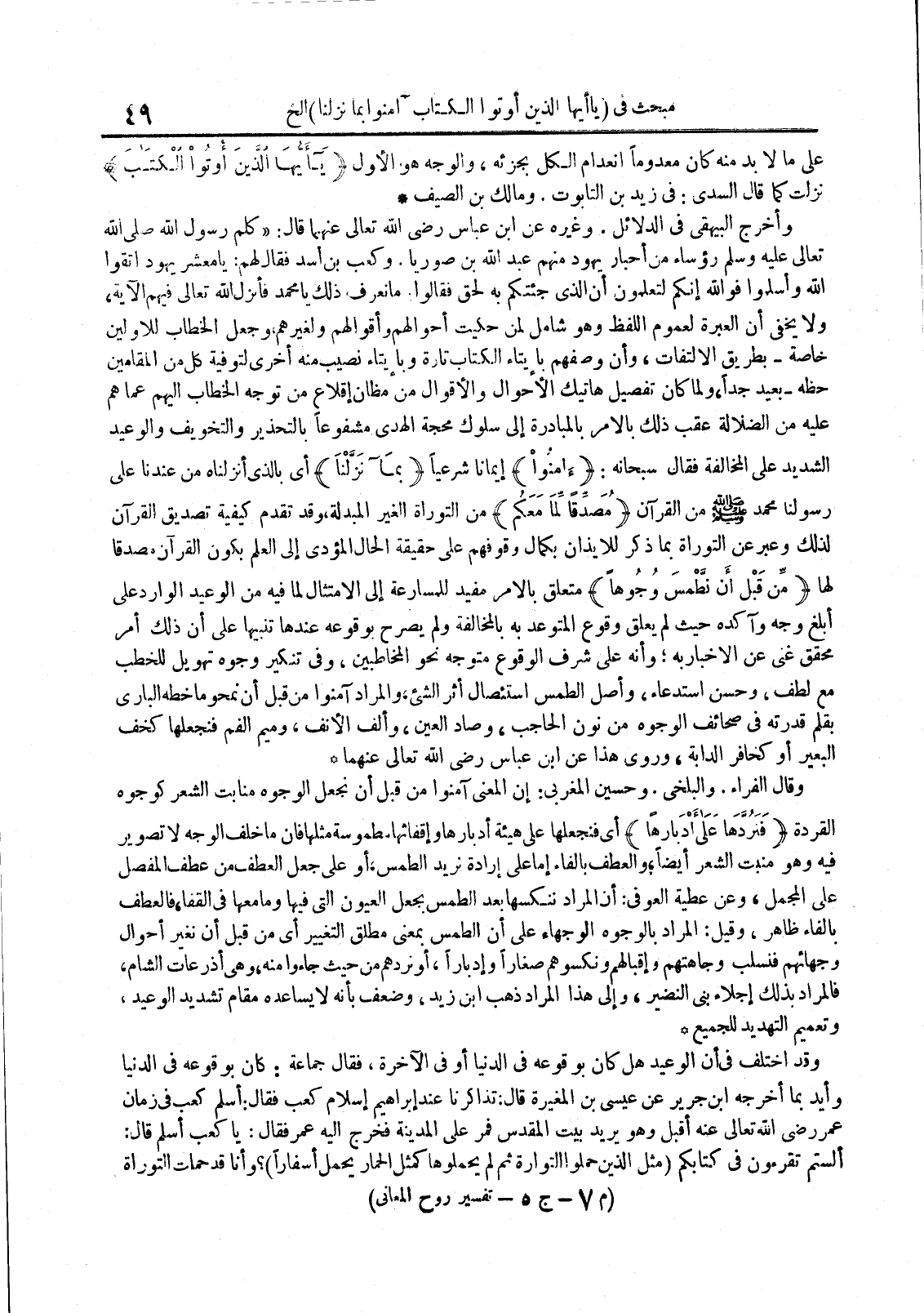 على ما لابد منه كان معدوما انعدام الكل بجزئه والوجه هو الأول يا أيها الذين أوتوا الكتب نزلت كما قال السدي : في زيد بن تابوت ومالك بن الصيف