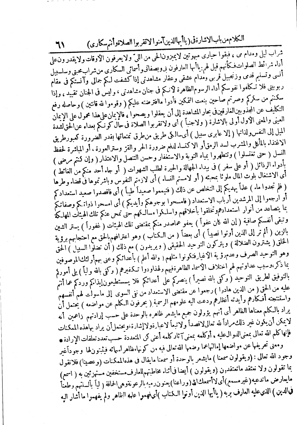شراب 3 ليلي ومدام مي فبقوا حيارى مبهوتين لا يميزون الحي من اللي ولا يعرفون الأوقات ولا يقدرون على أداء شرائط الصلوات فكأنهم قيل لهم : يا أيها العارفون بي وبصفاتي وأسمائي السكارى من شراب محبتي وسلسبيل أنسي وتسنيم قدمي وزنجبيل قربي ومدام عشقي وعقار مشاهدتي إذا كشفت لكم جمالي وآنستكم في مقام ربوبيتي فلا تكلفوا نفوسكم أداء الرسوم الظاهرة لأنكم في جنان مشاهدتي وليس في الجنان تقييد وإذا سكنتم من سكركم وصرتم صاحين بنعمت التمكين فأدوا ما افترضته عليكم وقوموا لله قانتين وحاصله رفع التكليف عن المجذوبين الغارقين في بحار المشاهدة إلى أن يعقلوا ويصحوا فالإيمان على هذا محمول على الإيمان العيني والمعنى الأول أولى بالإشارة ولا جنبا أي ولا تقربوا الصلاة في حال كونكم بعداء عن الحق لشدة الميل إلى النفس ولذاتها إلا عابري سبيل أي سالكي طريق من طرق تمتعاتها بقدر الضرورة كعبور طريق الإغتذاء بالمأكل والمشرب لسد الرمق او الاكتساء لدفع ضرورة الحر والقر وستر العورة أو المباشرة لحفظ النسل حتى تغتسلوا وتتطهروا بمياه التوبة والاستغفار وحسن التنصل والاعتذار وإن كنتم مرضى بأدواء الرذائل أو على سفر في بيداء الجهالة والحيرة لطلب الشهوات أو جاء أحد منكم من الغائط أي الاشتغال بلوث المال ملوثا بمحبته أو لامستم النساء أي لازمتم النفوس وباشرتموها في قضاء وطرها فلم تجدوا ماء علما يهديكم إلى التخلص عن ذلك فتيمموا صعيدا طيبا أي فاقصدوا صعيد استعدادكم أو ارجعوا إلى المرشدين أرباب الاستعداد فامسحوا بوجوهكم وأيديكم أي امسحوا ذواتكم وصفاتكم بما يتصاعد من أنوار استعدادهم وتخلقوا بأخلاقهم واسلكوا مسالكهم حتى تمحى عنكم تلك الهيئات المهلكة وتبقى أنفسكم صافية إن الله كان عفوا يعفو عما صدر منكم بمقتضى تلك الهيئات غفورا يستر الشين بالزين ألم تر إلى الذين أوتوا نصيبا أي بعضا من الكتاب وهو اعترافهم بالحق مع احتجابهم برؤية الخلق يشترون الضلالة ويتركون التوحيد الحقيقي ويريدون مع ذلك أن تضلوا السبيل الحق وهو التوحيد الصرف وعدم رؤية الأغيار فتكونوا مثلهم والله أعلم بأعدائكم وعنى بهم أولئك الموصوفين بما ذكر وسبب عداوتهم لهم اختلاف الأسماء الظاهرة فيهم ولهذا ودوا تكفيرهم وكفى بالله وليا يلي أموركم بالتوفيق لطريق التوحيد وكفى بالله نصيرا ينصركم على أعدائكم فلا يستطيعون إيذاءكم وردكم عما أنتم عليه من الحق من الذين هادوا رجعوا عن مقتضى الاستعداد من نفي السوي إلى ما سولت لهم أنفسهم واستنتجته أفكارهم وأيدته أنظارهم ودعت إليه علومهم الرسمية يحرفون الكلم عن مواضعه يحتمل أن يراد بالكلم معناها الظاهر أي أنهم يؤولون جميع ما يشعر ظاهره بالوحدة على حسب إرادتهم زاعمين أنه لا يمكن أن يكون غير ذلك مرادا لله تعالى لا قصدا ولا تبعا لا عبارة ولا إشارة ويحتمل أن يراد بها هذه الممكنات فإنها كلم الله تعالى بمعنى الدوال عليه أو كلمة بمعنى آثار كلمة أعني كن المتعددة حسب تعدد تعلقات الإرادة