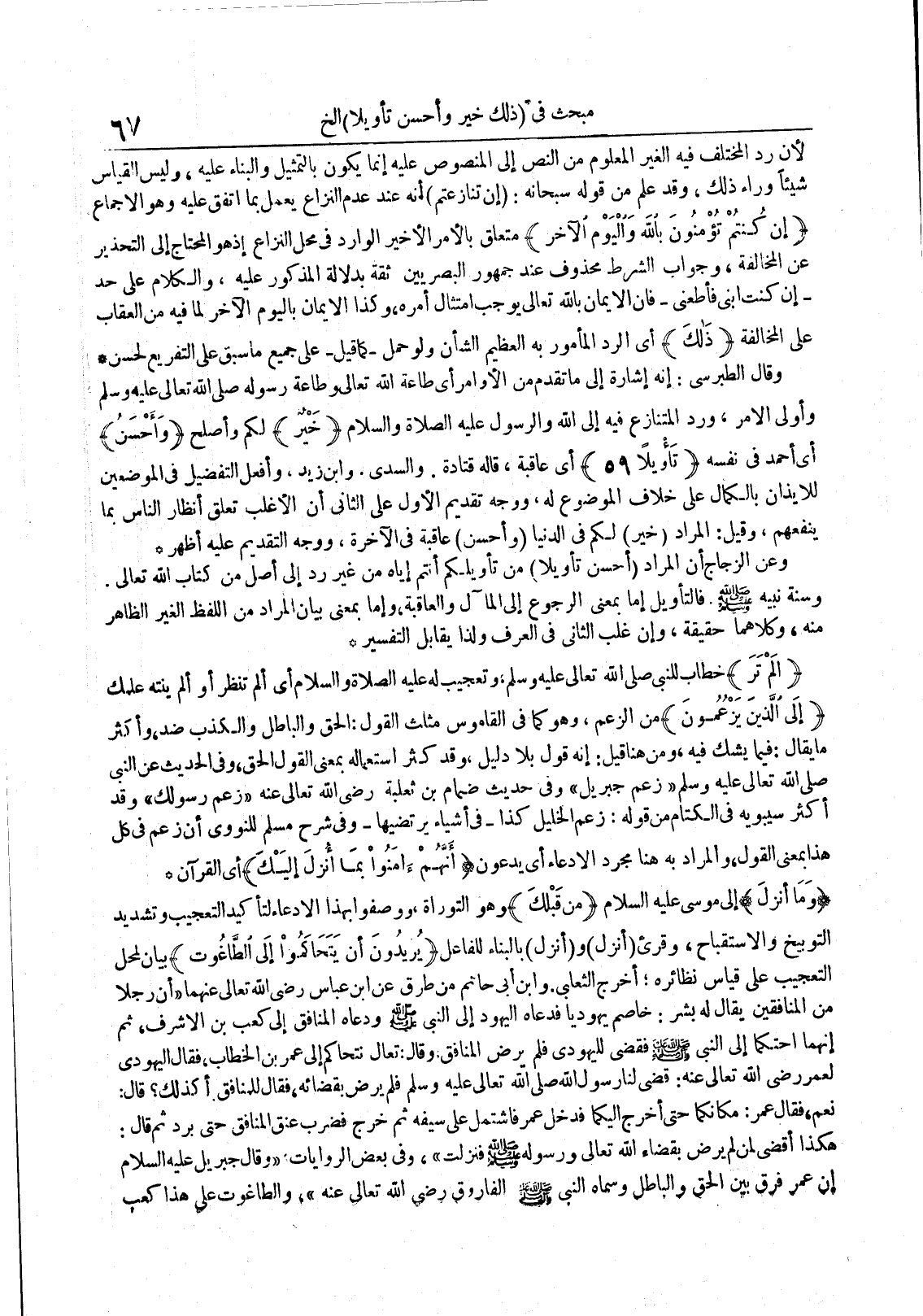 وقال الطبرسي : إنه إشارة إلى ما تقدم من الأوامر أي طاعة الله تعالى وطاعة رسوله صلى الله تعالى عليه وسلم وأولي الأمر ورد المتنازع فيه إلى الله والرسول عليه الصلاة و السلام خير لكم وأصلح وأحسن أي أحمد في نفسه تأويلا