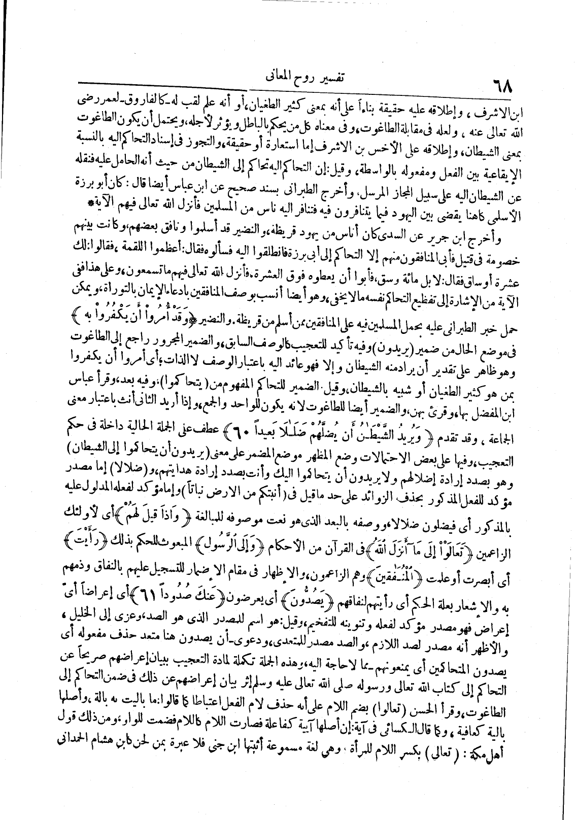 بن الأشرف وإطلاقه عليه حقيقة بناءا على أنه بمعنى كثير الطغيان أو أنه علم لقب له كالفاروق لعمر رضي الله تعالى عنه ولعله في مقابلة الطاغوت وفي معناه كل من يحكم بالباطل ويؤثر لأجله ويحتمل أن يكون الطاغوت بمعنى الشيطان وإطلاقه على الأخس بن الأشرف إما استعارة أو حقيقة والتجوز في إسناد التحاكم إليه بالنسبة الإيقاعية بين الفعل ومفعوله بالواسطة وقيل : إن التحاكم إليه تحاكم إلى الشيطان من حيث أنه الحامل عليه فنقله عن الشيطان إليه على سبيل المجاز المرسل وأخرج الطبراني بسند صحيح عن ابن عباس أيضا قال : كان أبو برزة الأسلمي كاهنا يقضي بين اليهود فيما يتنافرون فيه فتنافر إليه ناس من المسلمين فأنزل الله تعالى فيهم الآية