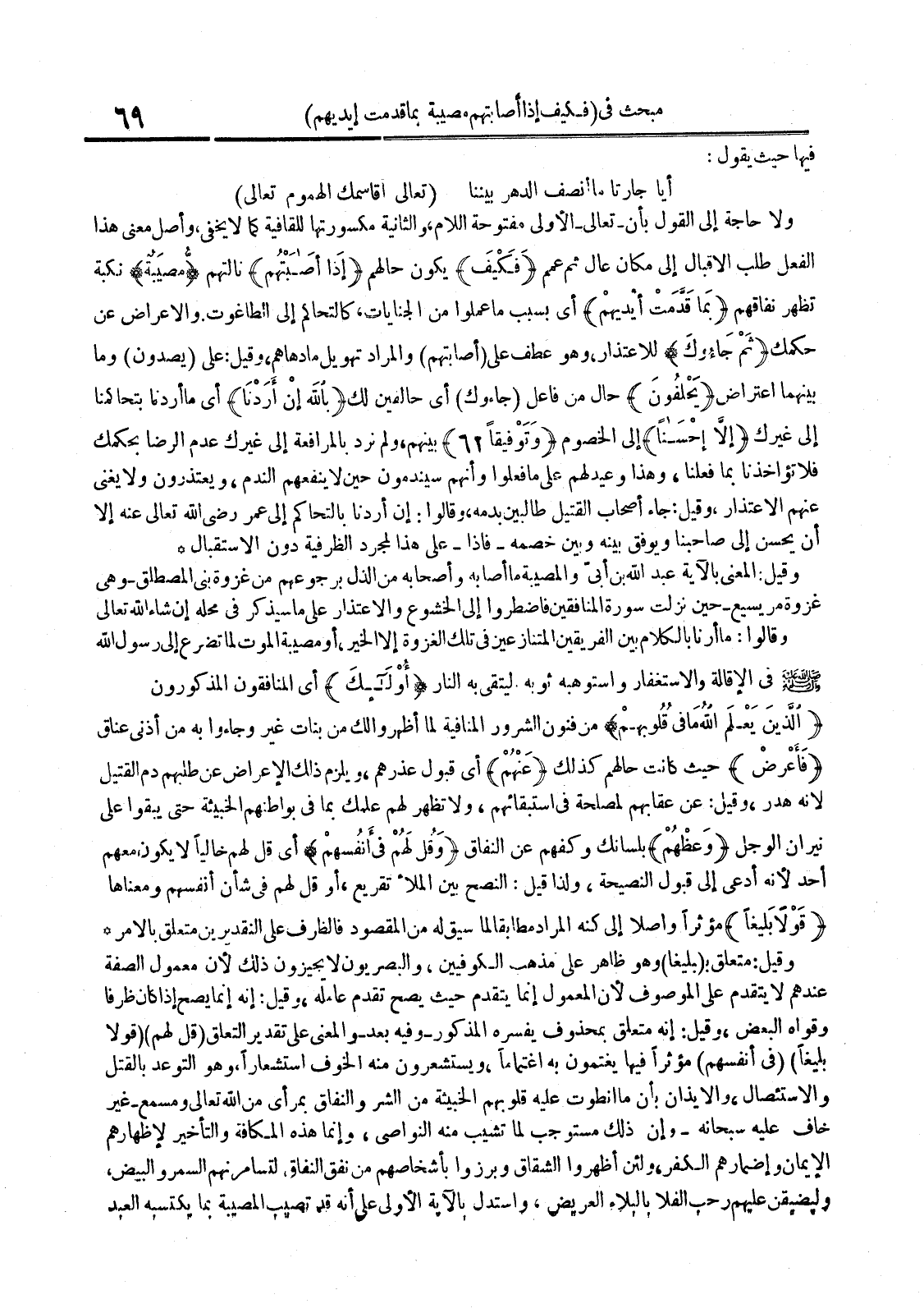 62 - بينهم ولم نرد بالمرافعة إلى غيرك عدم الرضا بحكمك فلا تؤاخذنا بما فعلنا وهذا وعيد لهم على ما فعلوا وأنهم سيندمون حين لا ينفعهم الندم ويعتذرون ولا يغني عنهم الاعتذار وقيل : جاء أصحاب القتيل طالبين بدمه وقالوا : إن أردنا بالتحاكم إلى عمر رضي الله تعالى عنه إلا أن يحسن إلى صاحبنا ويوفق بينه وبين خصمه فإذا على هذا لمجرد الظرفية دون الاستقبال