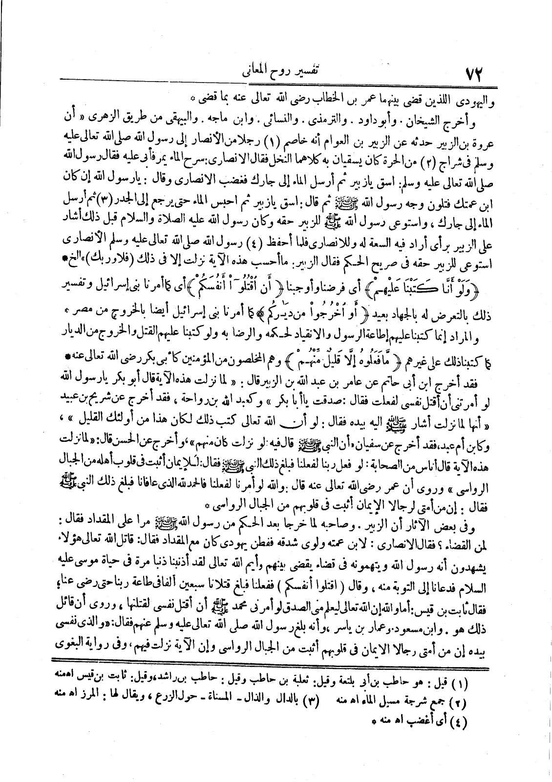 وفي بعض الآثار أن الزبير وصاحبه لما خرجا بعد الحكم من رسول الله صلى الله عليه و سلم مرا على المقداد فقال : لمن القضاء فقال الأنصاري : لابن عمته ولوى شدقه ففطن يهودي كان مع المقداد فقال : قاتل الله تعالى هؤلاء يشهدون أنه رسول الله ويتهمونه في قضاء يقضي بينهم وأيم الله تعالى لقد أذنبنا ذنبا مرة في حياة موسى عليه السلام فدعانا إلى التوبة منه وقال اقتلوا أنفسكم ففعلنا فبلغ قتلانا سبعين ألفا في طاعة ربنا حتى رضي عنا فقال ثابت بن قيس : أما والله إن الله تعالى ليعلم مني الصدق لو أمرني محمد صلى الله عليه و سلم أن أقتل نفسي لقتلتها وروي أن قائل ذلك هو وابن مسعود وعمار بن ياسر وأنه بلغ رسول الله صلى الله تعالى عليه وسلم عنهم فقال : والذي نفسي بيده إن من أمتي رجالا الإيمان في قلوبهم أثبت من الجبال الرواسي وإن الآية نزلت فيهم وفي رواية البغوي